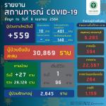 ส่งผลให้ผู้ป่วยยืนยันสะสม 30,869 คน เป็นการติดเชื้อในประเทศ 27,682 คน จากการคัดกรองเชิงรุก 16,838 คน จากผู้เดินทางจากต่างประเทศ 3,187 คน และสถานที่กักกันที่รัฐจัดให้ 2,558 คน มีผู้ป่วยหายเพิ่ม 27 คน รวมหายป่วยแล้ว 28,128 คน อยู่ระหว่างการรักษา 2,645 คน เสียชีวิตรวม 96 คน