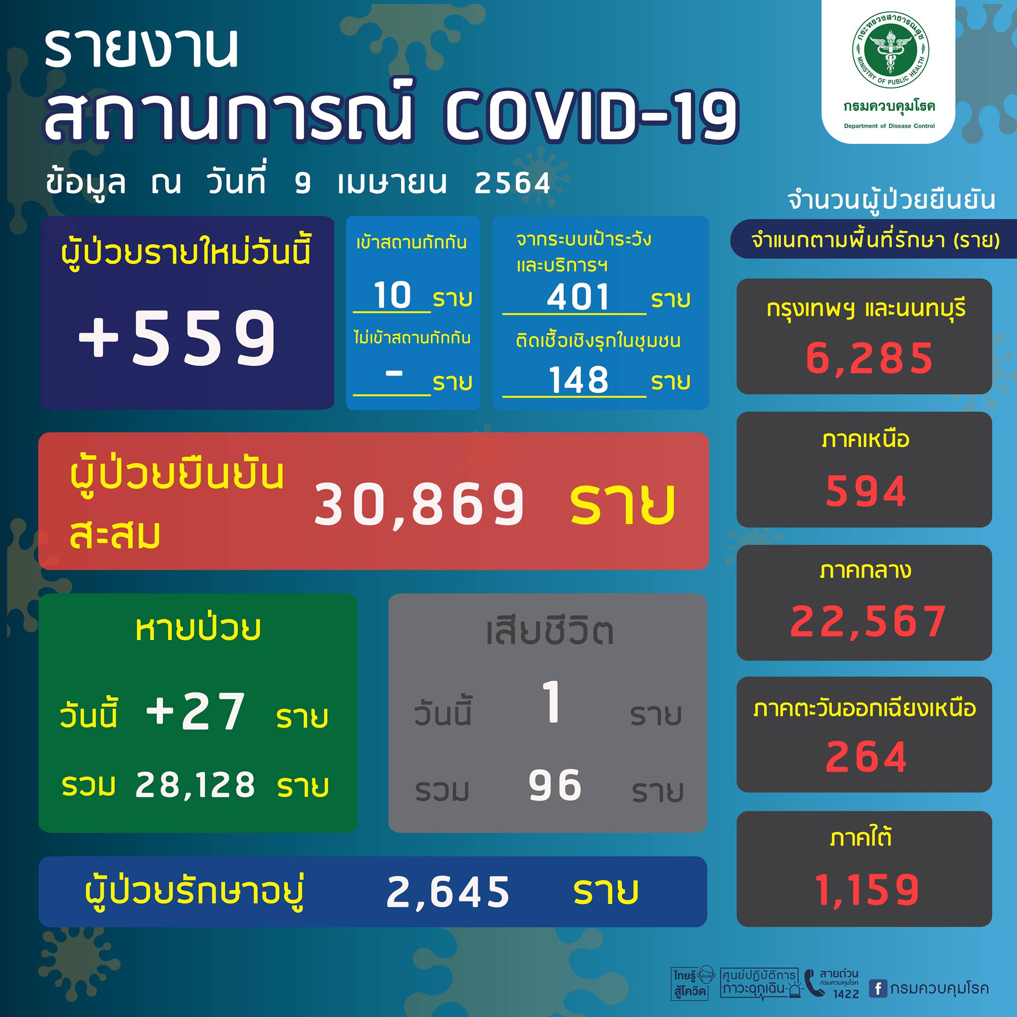 ส่วนสถานการณ์การติดเชื้อโควิด-19 ในวันนี้ (9 เม.ย.64 ) พบผู้ป่วยรายใหม่ 559 คน เป็นติดเชื้อในประเทศ 549 คน ซึ่งมาจากระบบเฝ้าระวังและระบบบริการ 401 คน และการค้นหาเชิงรุกในชุมชน 148 คน และผู้เดินทางจากต่างประเทศและเข้าสถานที่กักกันที่รัฐจัดให้ 10 คน เสียชีวิต 1 คน