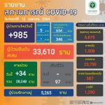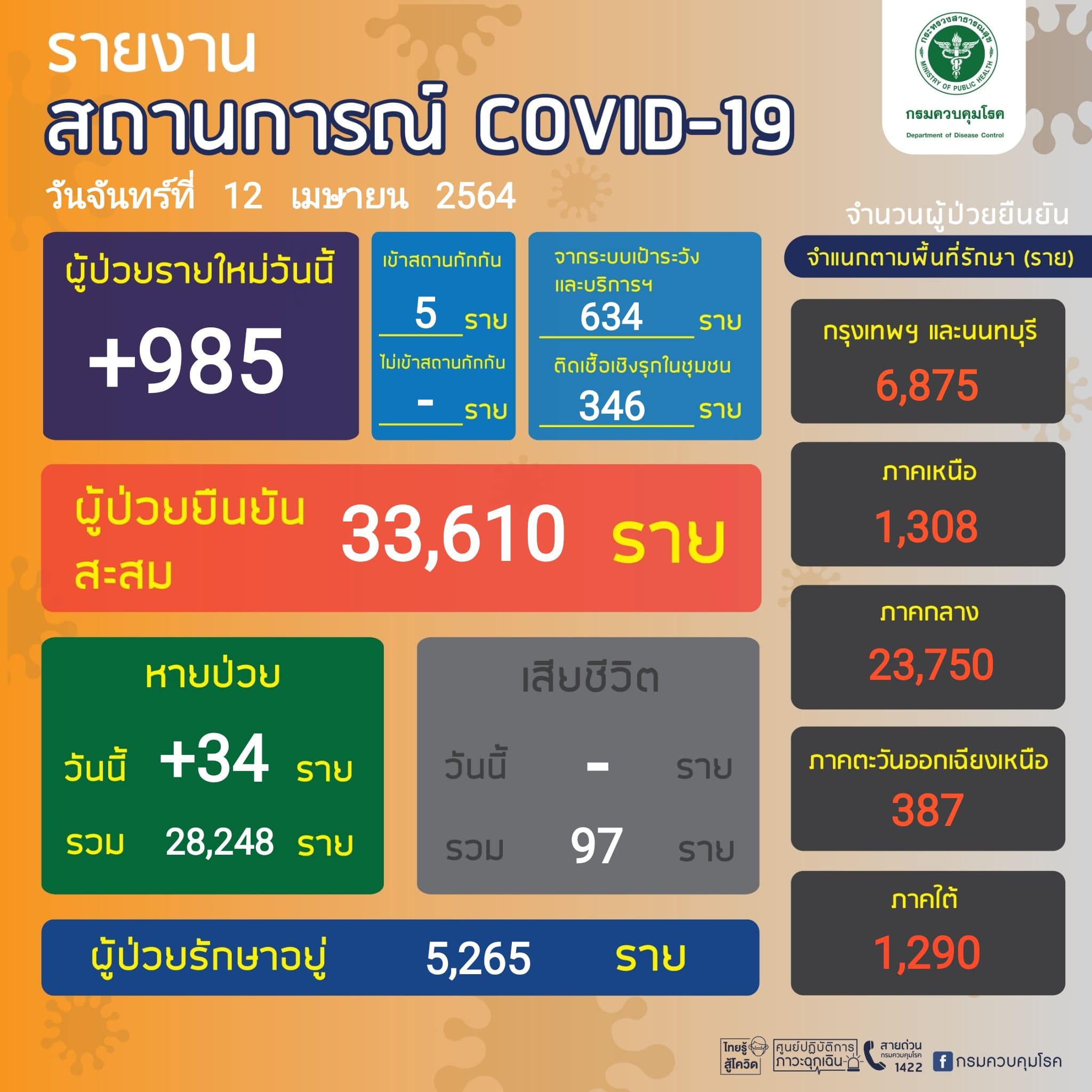 วันที่ 12 เมษายน 2564 ที่กระทรวงสาธารณสุข นพ.โอภาส การย์กวินพงศ์ อธิบดีกรมควบคุมโรค รายงานสถานการณ์ผู้ติดเชื้อประจำวันว่า พบผู้ป่วยรายใหม่เพิ่ม 985 ราย เป็นในระบบบริการ 634 ราย คัดกรองเชิงรุก 364 ราย มาจากต่างประเทศ 5 ราย ป่วยสะสม 33,610 ราย
