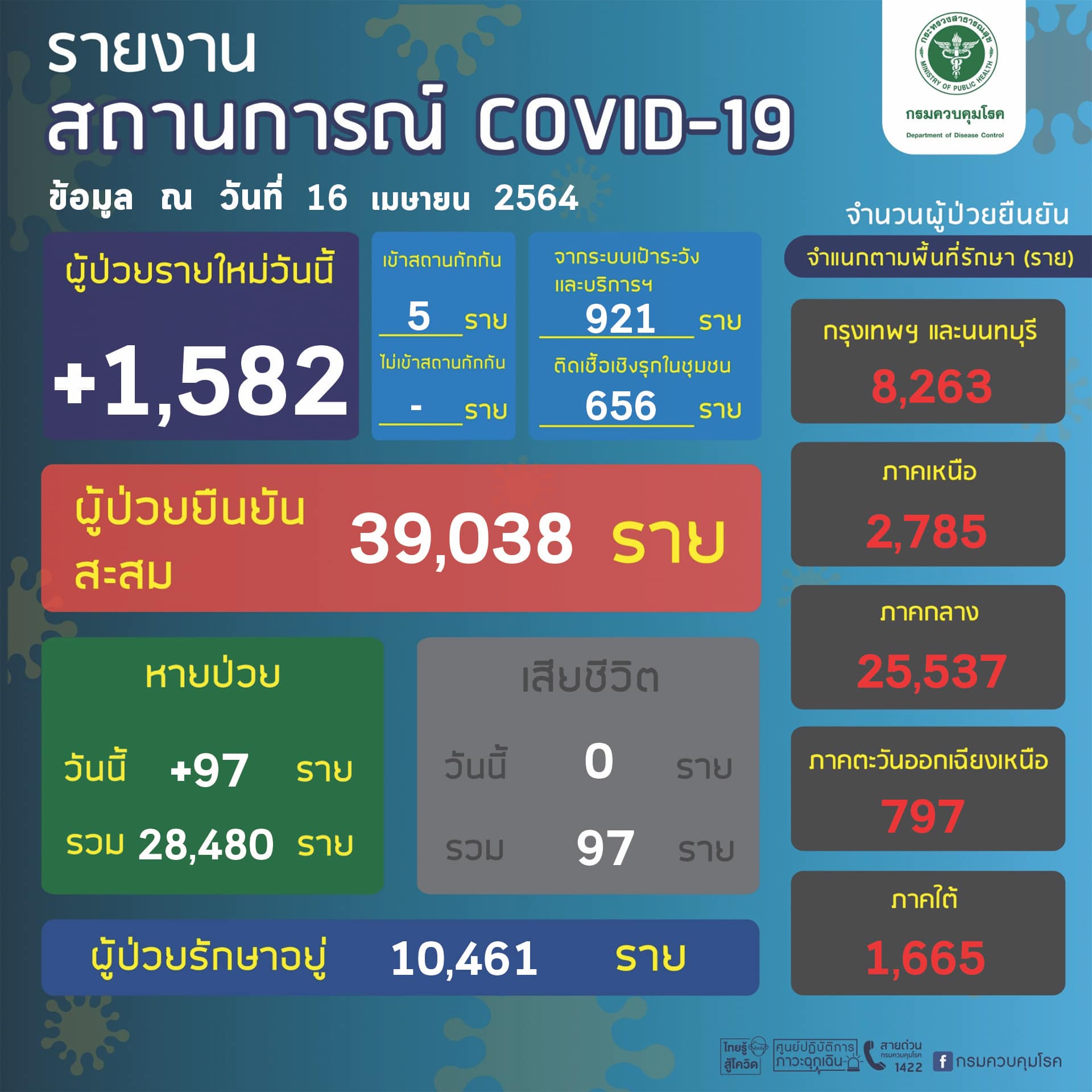 กรมควบคุมโรค กระทรวงสาธารณสุข (สธ.) รายงานสถานการณ์ผู้ติดเชื้อประจำวันว่า พบผู้ติดเชื้อรายใหม่เพิ่มขึ้น 1,582 ราย ยอดผู้ป่วยสะสม 39,038 ราย เสียชีวิตสะสม 97 ราย