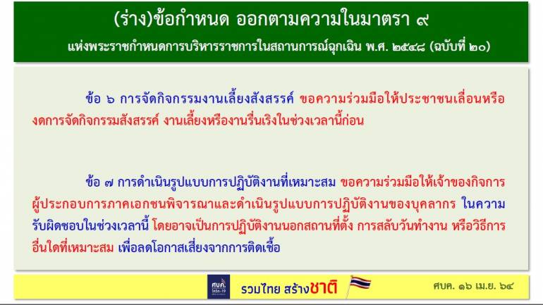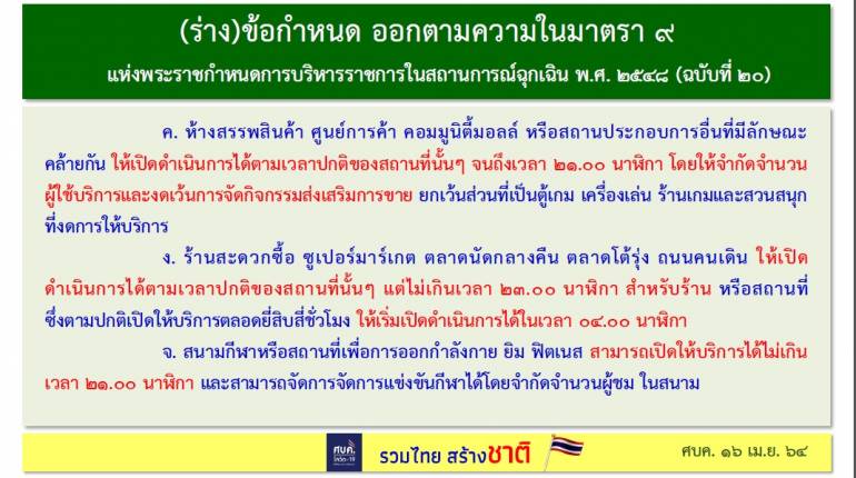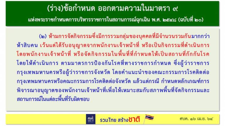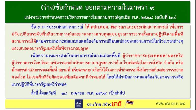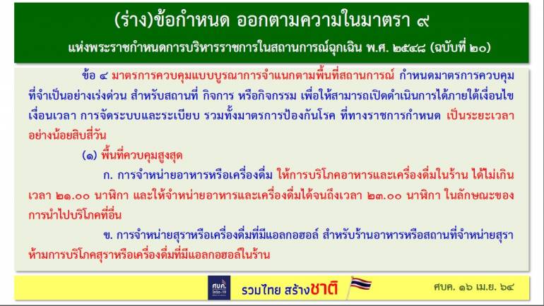 ศบค.ใช้ 9 มาตรการ ควบคุมการแพร่ระบาดของไวรัส COVID-19 หลังจากไม่เคอร์ฟิวส์ ไม่ล็อกดาวน์ หวั่นกระทบคนรากหญ้า เช่น ห้ามดื่มเหล้าในร้าน ห้ามปาร์ตี้ ฯลฯ
