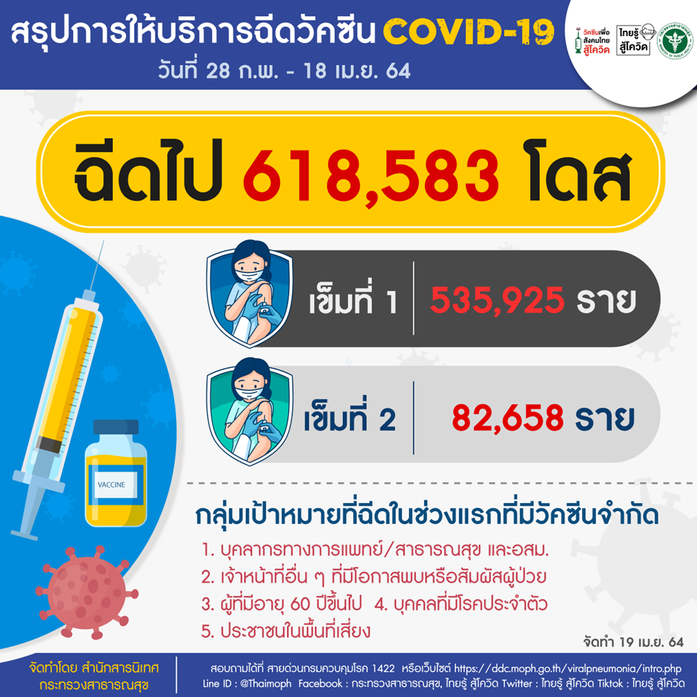 กระทรวงสาธารณสุข ยืนยันการฉีดวัคซีนของไทยเป็นไปตามแผน ไม่ได้ล่าช้า ฉีดแล้ว 618,583 รายเข็มแรก 535,925 ราย เข็มที่ 2 จำนวน 82,658 ราย ประชาชนลงทะเบียนฉีดวัคซีนได้ใน Line Official Account หมอพร้อม หรือแอปพลิเคชัน หมอพร้อม ในเดือนพฤษภาคม