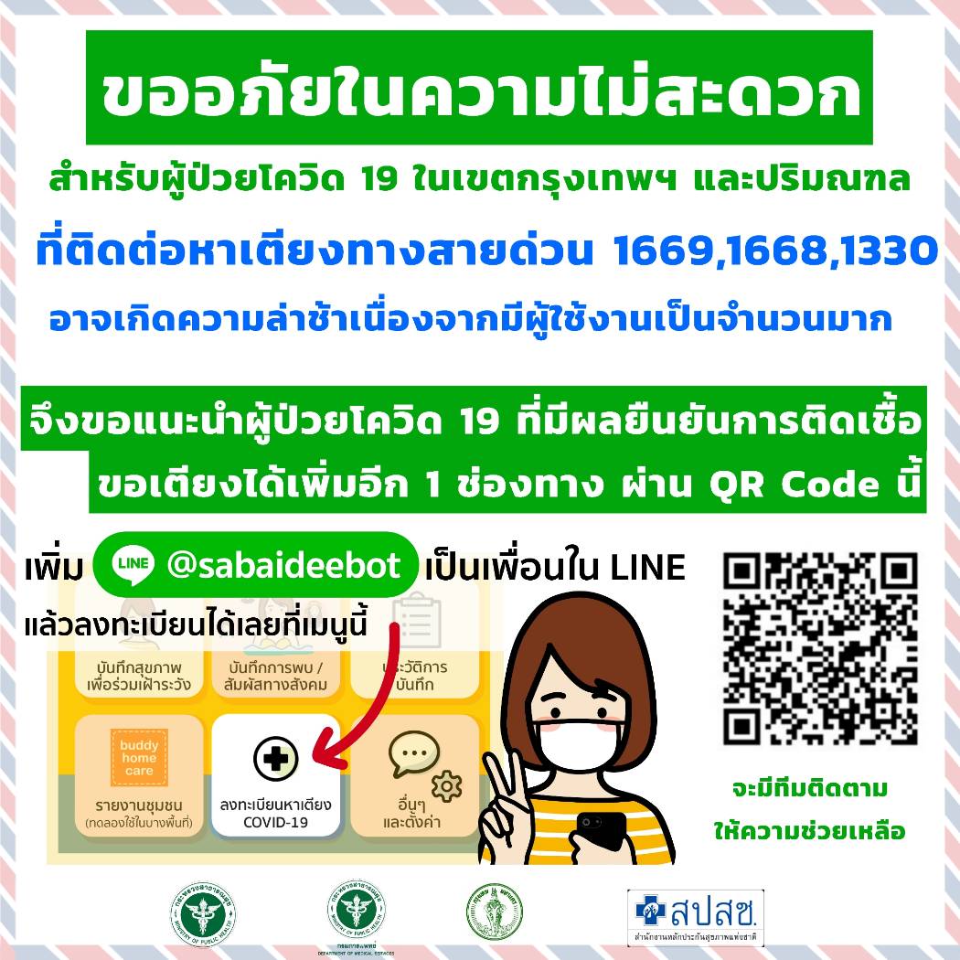 กระทรวงสาธารณสุข เพิ่มช่องทางไลน์ @sabaideebot ช่วยผู้ติดเชื้อโควิด 19 ที่รอเตียง รองรับผู้ติดเชื้อในเขต กทม.และปริมณฑลที่เพิ่มขึ้นวันละหลายร้อยคน ทำให้สายด่วน 1668 รับสายล่าช้า แนะผู้ติดเชื้อเตรียมเอกสารยืนยันผลการตรวจหาเชื้อ เพื่อความรวดเร็วในการเข้ารับรักษาในโรงพยาบาล