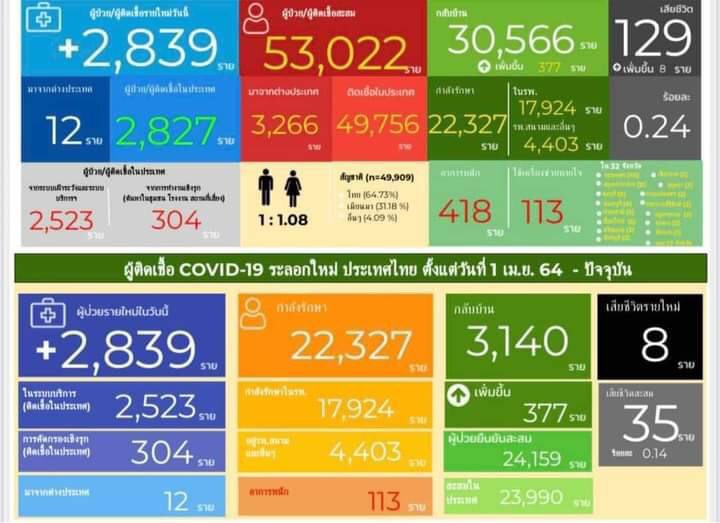 กรมควบคุมโรค กระทรวงสาธารณสุข(สธ.) รายงานสถานการณ์โควิด-19 ประจำวันว่า วันนี้พบจํานวนผู้ติดเชื้อโควิดรายใหม่เพิ่มขึ้น 2,839 ราย รวมผู้ป่วยสะสม 53,022 ราย ในจำนวนนี้รักษาหายแล้ว 30,566 ราย ยังเหลือที่รักษาอยู่ 22,327 ราย แบ่งเป็นในโรงพยาบาล 17,924 ราย โรงพยาบาลสนามและอื่นๆ 4,403 ราย มีผู้เสียชีวิตเพิ่ม 8 ราย สะสม 129 ราย ในจำนวนนี้เป็นผู้ป่วยที่มีอาการหนัก 418 ราย ต้องใช้ท่อช่วยหายใจ 113 ราย