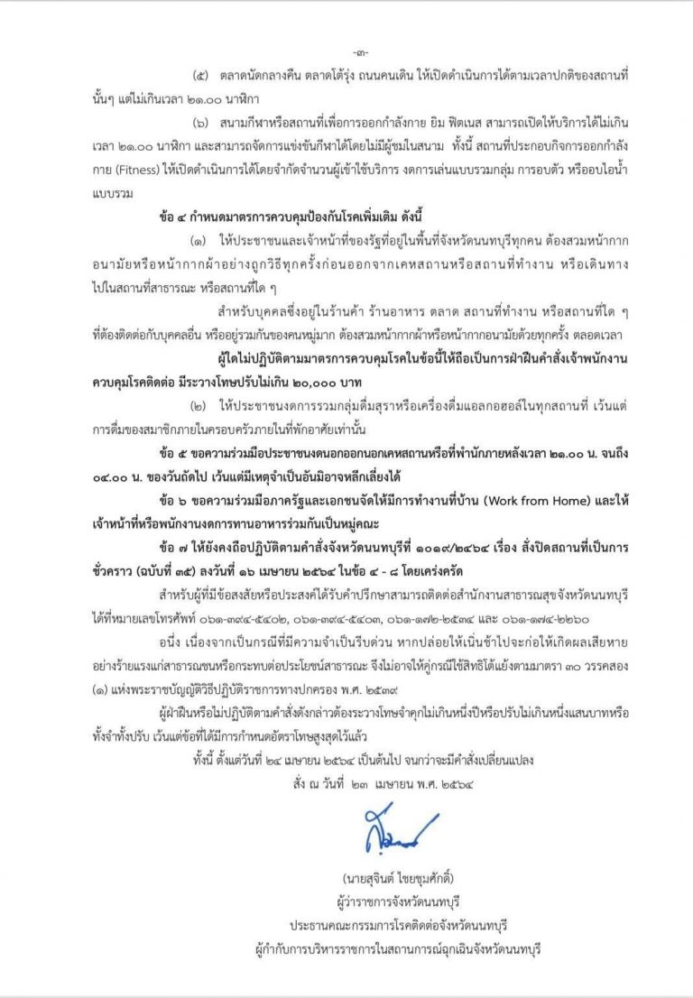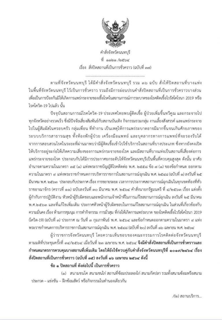 นายสุจินต์ ไชยชุมศักดิ์ ผู้ว่าราชการจังหวัดนนทบุรี มีคำสั่งจังหวัดนนทบุรี ที่ 1121/2564 ลงวันที่ 23 เมษายน 2564 เรื่อง สั่งปิดสถานที่เป็นการชั่วคราว (ฉบับที่ 37) มีผลตั้งแต่วันที่ 24 เมษายน 2564 จนกว่าจะมีคำสั่งเปลี่ยนแปลง โดยความเห็นชอบของคณะกรรมการโรคติดต่อจังหวัดนนทบุรี ตามมติที่ประชุมจึงมีคำสั่งปิดสถานที่เป็นการชั่วคราวและกำหนดมาตรการควบคุมบางสถานที่เพิ่มเติม โดยให้ยังใช้ควบคู่กับคำสั่งจังหวัดนนทบุรีที่ 1019/64