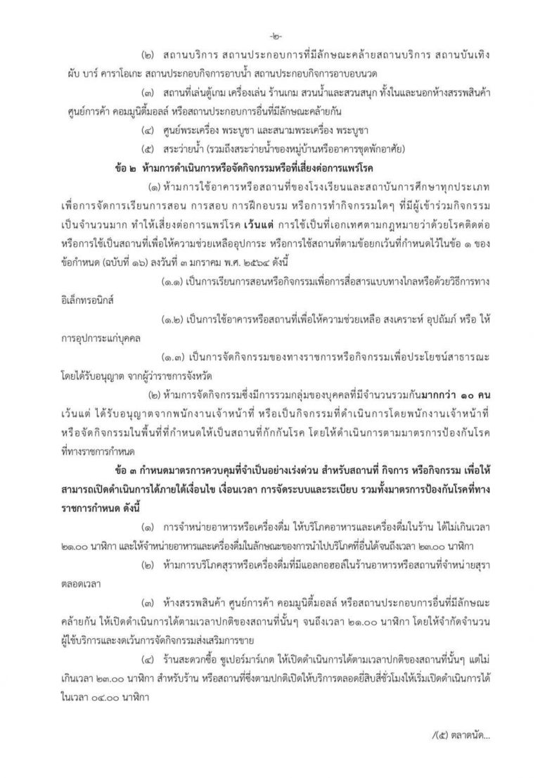 1.ปิดสถานที่ เป็นการชั่วคราว ดังนี้ สนามชนโค สนามชนไก่ สถานที่ซ้อมประลองไก่ สนามกัดปลา รวมทั้งสนามซ้อมหรือสนาม ประกวด แข่งขัน ฝึกซ้อมสัตว์ หรือกิจกรรมในทํานองเดียวกัน สถานบริการ สถานประกอบการที่มีลักษณะคล้ายสถานบริการ สถานบันเทิงผับ บาร์ คาราโอเกะ สถานประกอบกิจการอาบน้ำ สถานประกอบกิจการอาบอบนวด สถานที่เล่นเกม เครื่องเล่น ร้านเกม สวนน้ำและสวนสนุก ทั้งศูนย์การค้า คอมมูนิตี้มอลล์ หรือสถานประกอบการอื่นที่มีลักษณะคล้ายกัน ศูนย์พระเครื่อง พระบูชา และสนามพระเครื่อง พระบูชา สระว่ายน้ำ (รวมถึงสระว่ายน้ำของหมู่บ้านหรืออาคารชุดพักอาศัยในและนอกห้างสรรพสินค้า
