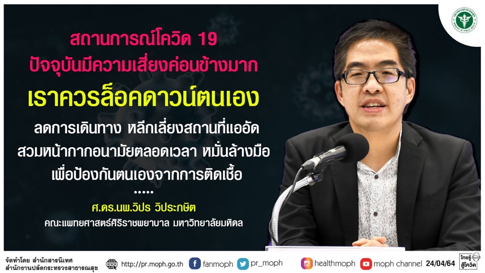 ศ.ดร.นพ. วิปร คณะแพทยศาสตร์ศิริราชพยาบาล ชี้วัคซีนมีประโยชน์มากกว่าความเสี่ยง ผลวิจัยทั้งต่างประเทศและไทย พบว่าช่วยสร้างภูมิต้านทานต่อโควิด 19 ลดความรุนแรงโรค ส่วนอาการไม่พึงประสงค์หากเกิดขึ้นรักษาได้ ชวนบุคลากรทางการแพทย์ไปรับการฉีด เหตุโอกาสเสี่ยงที่ติดเชื้อและมีอาการรุนแรงมีมากกว่าเกิดผลแทรกซ้อน แนะประชาชนล็อกดาวน์ตัวเอง งดการเดินทางไปต่างจังหวัด หลีกเลี่ยงการเข้าไปในที่ชุมชน สวมหน้ากากอนามัยตลอดเวลา หมั่นล้างมือ เข้มพฤติกรรมสุขภาพส่วนบุคคล ป้องกันการติดเชื้อ
