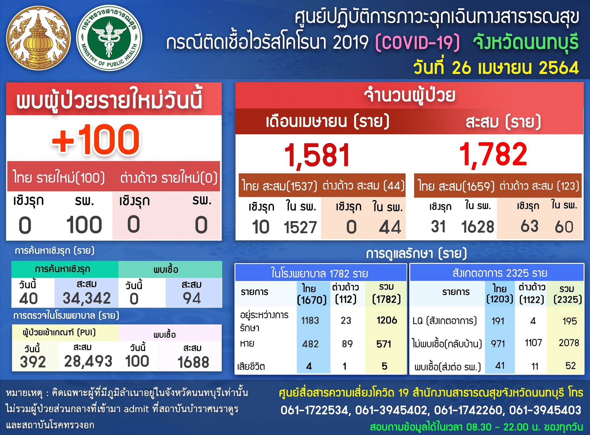 ผู้สื่อข่าวรายงานว่า เมื่อวันที่ 26 เม.ย. 2564 ศูนย์ปฏิบัติการ โควิด-19 จ.นนทบุรี รายงานว่าพบผู้ป่วยโควิด-19 ยืนยันเพิ่มอีก 100 ราย รวมสะสม 1,782 ราย ส่วนมากเกี่ยวข้องกับสถานบันเทิง และผู้สัมผัสใกล้ชิด โดยเป็นหญิง 45 ราย และชาย 55 ราย