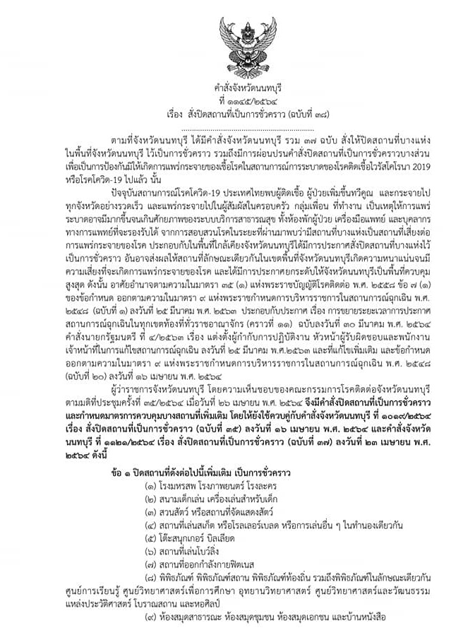 ผู้สื่อข่าวรายงานว่า เมื่อวันที่ 26 เมษายน 2564 จังหวัดนนทบุรี โดยนายสุจินต์ ไชยชุมศักดิ์ ผู้ว่าราชการจังหวัดนนทบุรี ในฐานะประธานคณะกรรมการโรคติดต่อจังหวัดนนทบุรี ผู้กำกับการบริหารราชการในสถานการณ์ฉุกเฉิน จังหวัดนนทบุรี ได้ออกคำสั่งจังหวัดนนทบุรี ที่ 1145/2564 ลงวันที่ 26 เมษายน 2564 เรื่อง สั่งปิดสถานที่เป็นการชั่วคราว (ฉบับที่ 38)