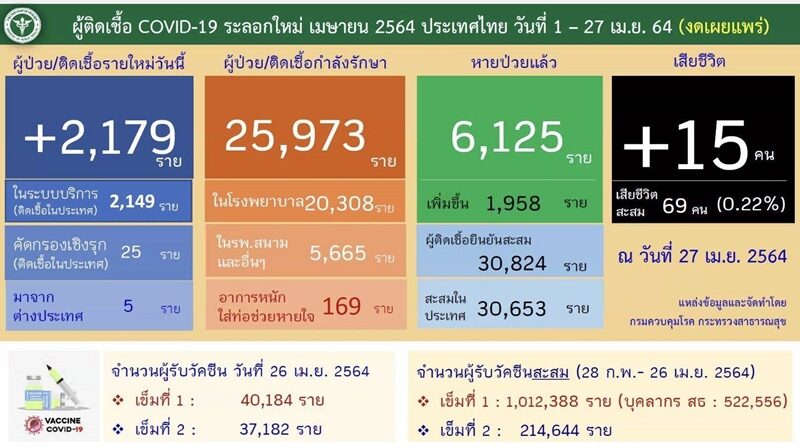 กรมควบคุมโรค กระทรวงสาธารณสุข รายงานสถานการณ์ไวรัสโคโรนา 2019 ล่าสุด วันนี้(27 เม.ย. 64) สถานการณ์ยังทรุดลงอย่างต่อเนื่อง หลังพบผู้ติดเชื้อโควิด-19 รายใหม่อีก 2,179 ราย โดยอยู่ในระบบบริการ(ติดเชื้อในประเทศ) 2,149 ราย คัดกรองเชิงรุก 25 ราย และมาจากต่างประเทศ 5 ราย