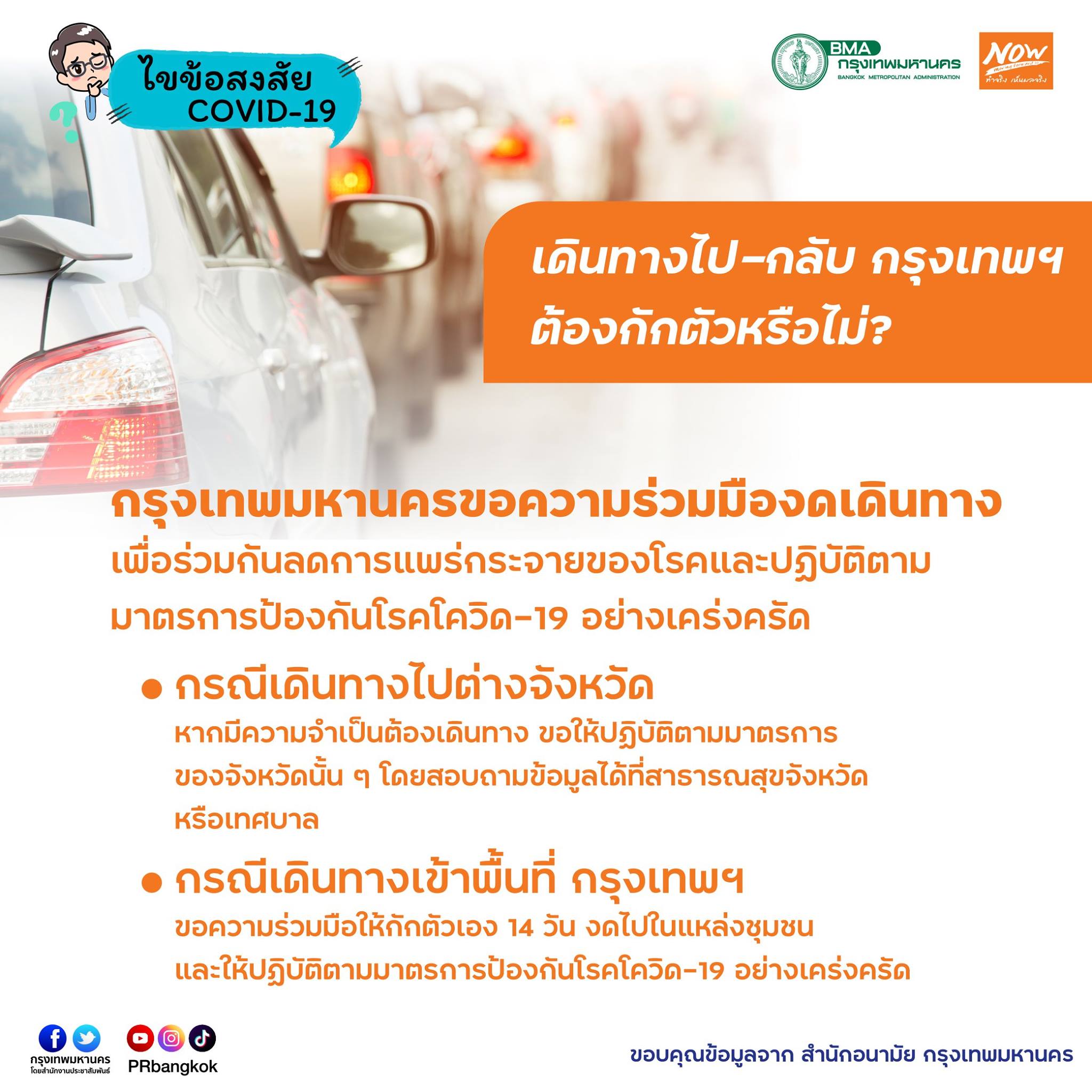ผู้ที่เดินทางเข้าพื้นที่ กทม. ขอความร่วมมือให้กักตัวเองเป็นเวลา 14 วัน พร้อมงดไปแหล่งชุมชน และให้ปฏิบัติตามมาตรการป้องกันโควิด-19 อย่างเคร่งครัด