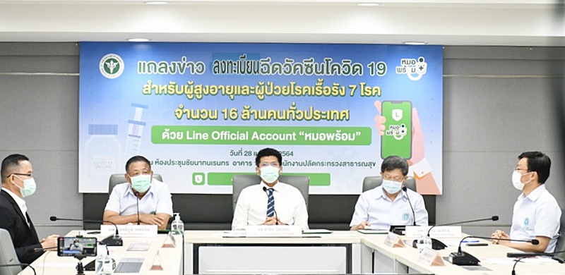 วันนี้ (28 เมษายน 2564) ที่กระทรวงสาธารณสุข จ.นนทบุรี ดร.สาธิต ปิตุเตชะ รัฐมนตรีช่วยว่าการกระทรวงสาธารณสุข พร้อมด้วย นายแพทย์โสภณ เมฆธน ผู้ช่วยรัฐมนตรีประจำกระทรวงสาธารณสุข ในฐานะประธานคณะกรรมการอำนวยการบริหารจัดการการให้วัคซีนป้องกันโรคโควิด 19 นายแพทย์เกียรติภูมิ วงศ์รจิต ปลัดกระทรวงสาธารณสุข และนายแพทย์โสภณ เอี่ยมศิริถาวร รองอธิบดีกรมควบคุมโรค ร่วมกันแถลงข่าว ลงทะเบียนฉีดวัคซีนโควิด 19 สำหรับผู้สูงอายุและผู้ป่วยโรคเรื้อรัง 7 โรค ผ่าน Line Official Account “หมอพร้อม”