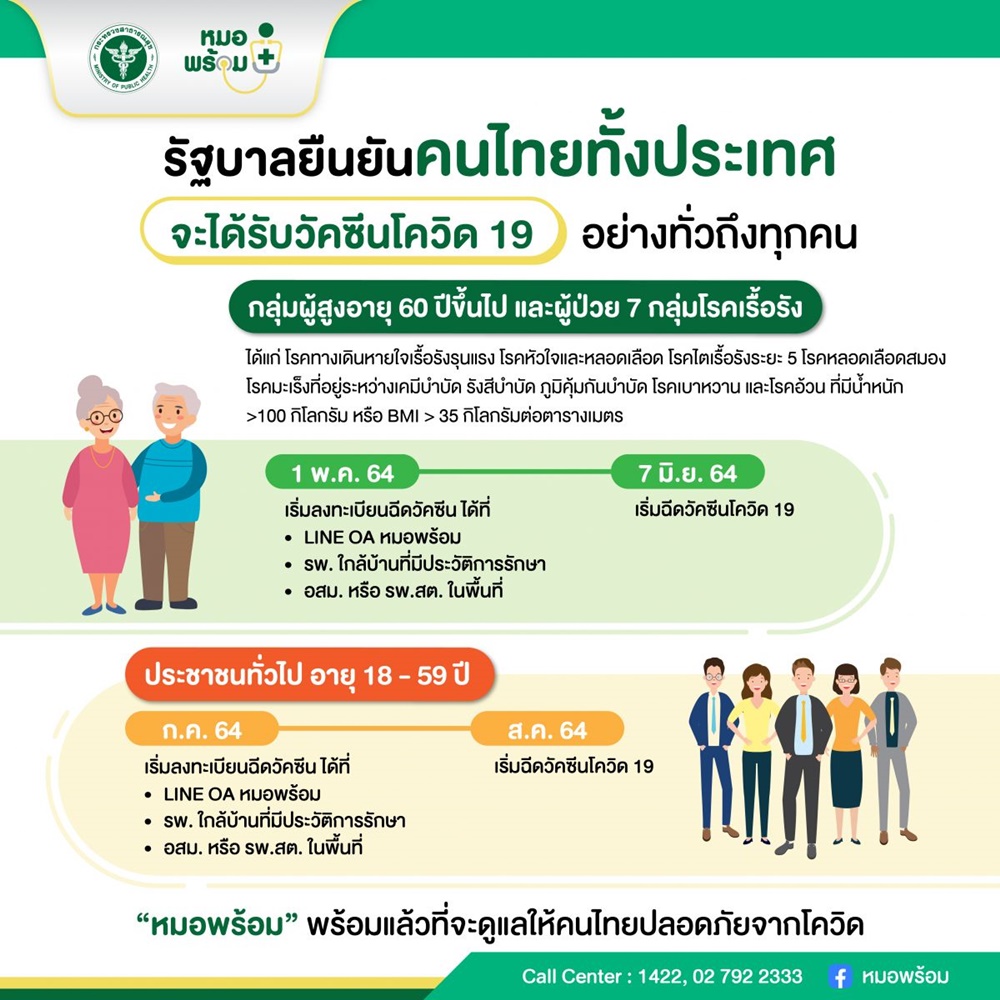 รัฐบาลยืนยันคนไทยทั้งประเทศจะได้รับการฉีดวัคซีนโควิด 19 อย่างทั่วถึงทุกคน วันที่ 1 พ.ค.นี้ เปิดลงทะเบียนฉีดวัคซีนโควิด 19 ในกลุ่มผู้สูงอายุ 60 ปีขึ้นไปและผู้มีโรคประจำตัว 7 กลุ่มโรค รวม 16 ล้านคน ผ่านไลน์ “หมอพร้อม” เวอร์ชัน 2 หรือติดต่อรพ.ใกล้บ้านที่มีประวัติการรักษา รพ.สต./อสม. ในพื้นที่ เริ่มฉีดวัคซีน 7 มิ.ย. – 31 ก.ค. ส่วนประชาชนทั่วไปอายุ 18-59 ปี ลงทะเบียนวันที่ 1 ก.ค. รับการฉีดตั้งแต่ส.ค.เป็นต้นไป