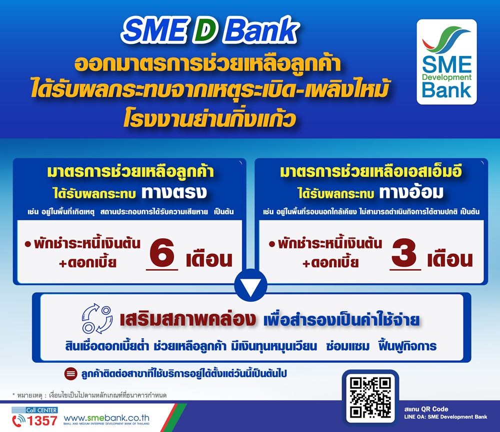 SME D Bank ออกมาตรการเร่งด่วน ช่วยเหลือลูกค้าได้รับผลกระทบจากเหตุระเบิด-เพลิงไหม้โรงงานย่านกิ่งแก้ว สำหรับกลุ่มได้รับผลกระทบทางตรง พักชำระหนี้เงินต้นและดอกเบี้ย นาน 6 เดือน และกลุ่มได้รับผลกระทบทางอ้อม พักชำระหนี้เงินต้นและดอกเบี้ย นาน 3 เดือน ควบคู่เติมทุนเสริมสภาพคล่อง เพื่อสำรองเป็นค่าใช้จ่าย