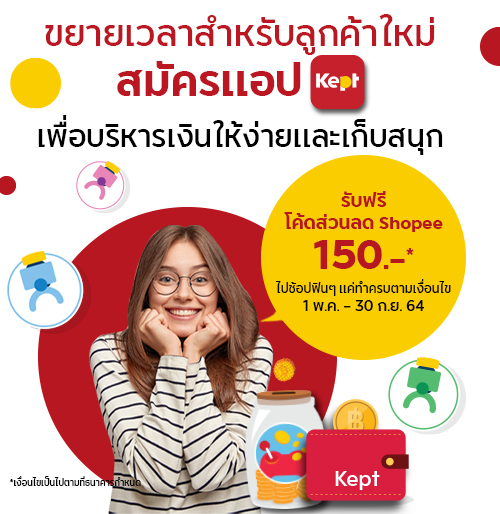 เพียงผู้สนใจสมัครใช้บริการแอปพลิเคชัน Kept พร้อมทำภารกิจตามเงื่อนไขให้สำเร็จ รับโค้ดส่วนลด Shopee มูลค่า 150 บาท เมื่อดาวน์โหลดแอป Kept และสมัครสำเร็จ เริ่มภารกิจได้ทันทีด้วยการโอนเงินเข้าบัญชี Kept ขั้นต่ำ 1,000 บาท 1 รายการ และทำการเปิดบัญชี Fun โดยตั้งค่าการใช้งานฟีเจอร์ “แอบเก็บ” และ “สั่งเก็บ” พร้อมทำรายการแอบเก็บและสั่งเก็บสำเร็จอย่างละ 1 รายการ ภายใน 14 วัน นับจากวันที่สมัครสำเร็จ เพียงเท่านี้ โค้ดส่วนลด Shopee มูลค่า 150 บาทจะถูกส่งผ่านทางอีเมลที่ลงทะเบียนไว้กับ Kept ภายใน 15 วัน โดยนับจากวันที่ทำรายการครบถ้วนและยืนยันอีเมลสำเร็จ