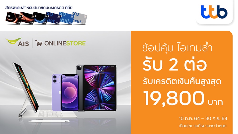 บัตรเครดิตทีทีบี ร่วมกับ เอไอเอส มอบสิทธิพิเศษคุ้ม 2 ต่อ แบ่งจ่ายสบาย ๆ 0% นาน 10 หรือ 24 เดือน และเครดิตเงินคืนสูงสุด 19,800 บาท ตั้งแต่วันนี้ ถึง 30 กันยายน 2564