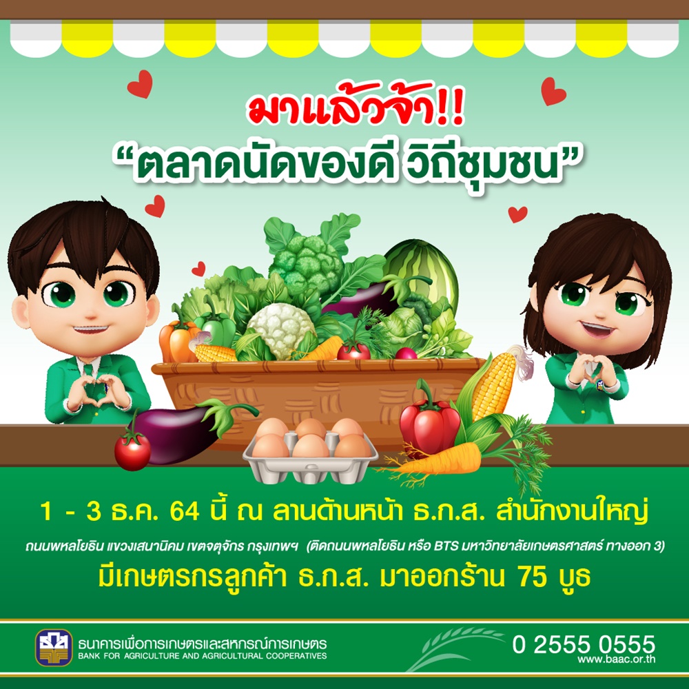 ธ.ก.ส. จัดตลาดนัดของดีวิถีชุมชน รวบรวมสินค้าเกษตร ผลิตภัณฑ์และของดีจากชุมชน ทั่วประเทศ อาทิ เครื่องหนัง ผลิตภัณฑ์จากไม้สัก อาหารทะเลแปรรูป ผ้าทอพื้นบ้าน เนื้อโคขุน ข้าวหอมมะลิ 100% เพื่อช่วยเพิ่มช่องทางการจำหน่ายสินค้า สร้างอาชีพ สร้างรายได้แก่เกษตรกร วิสาหกิจชุมชน และผู้ประกอบการ SMEs เกษตร ที่ได้รับผลกระทบจากการแพร่ระบาดของเชื้อไวรัส โควิด-19 และอุทกภัยมาจำหน่าย วันที่ 1 – 3 ธันวาคม 2564 ณ ธ.ก.ส. สำนักงานใหญ่ กรุงเทพฯ