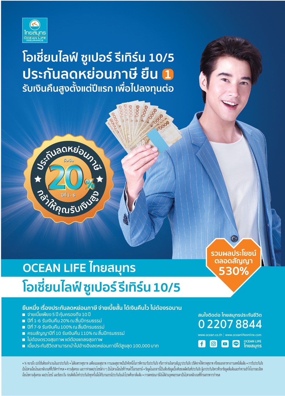 บมจ.ไทยสมุทรประกันชีวิต รักคือพลังของชีวิต โดยคุณนุสรา (อัสสกุล) บัญญัติปิยพจน์ ประธานเจ้าหน้าที่บริหาร และกรรมการผู้จัดการ ได้ส่งประกันลดหย่อนภาษียืนหนึ่ง “โอเชี่ยนไลฟ์ ซูเปอร์ รีเทิร์น 10/5” เพื่อเป็นตัวช่วยสุดปัง!! ให้กับกลุ่มคนวัยทำงานที่กำลังมองหาทางเลือกในการลดหย่อนภาษีที่คุ้มค่าในช่วงโค้งสุดท้ายปลายปี โดยชำระเบี้ยประกันภัยระยะสั้นเพียง 5 ปี คุ้มครองถึง 10 ปี รับเงินคืนสูงทุกปีตั้งแต่ปีแรกจนปีสุดท้าย