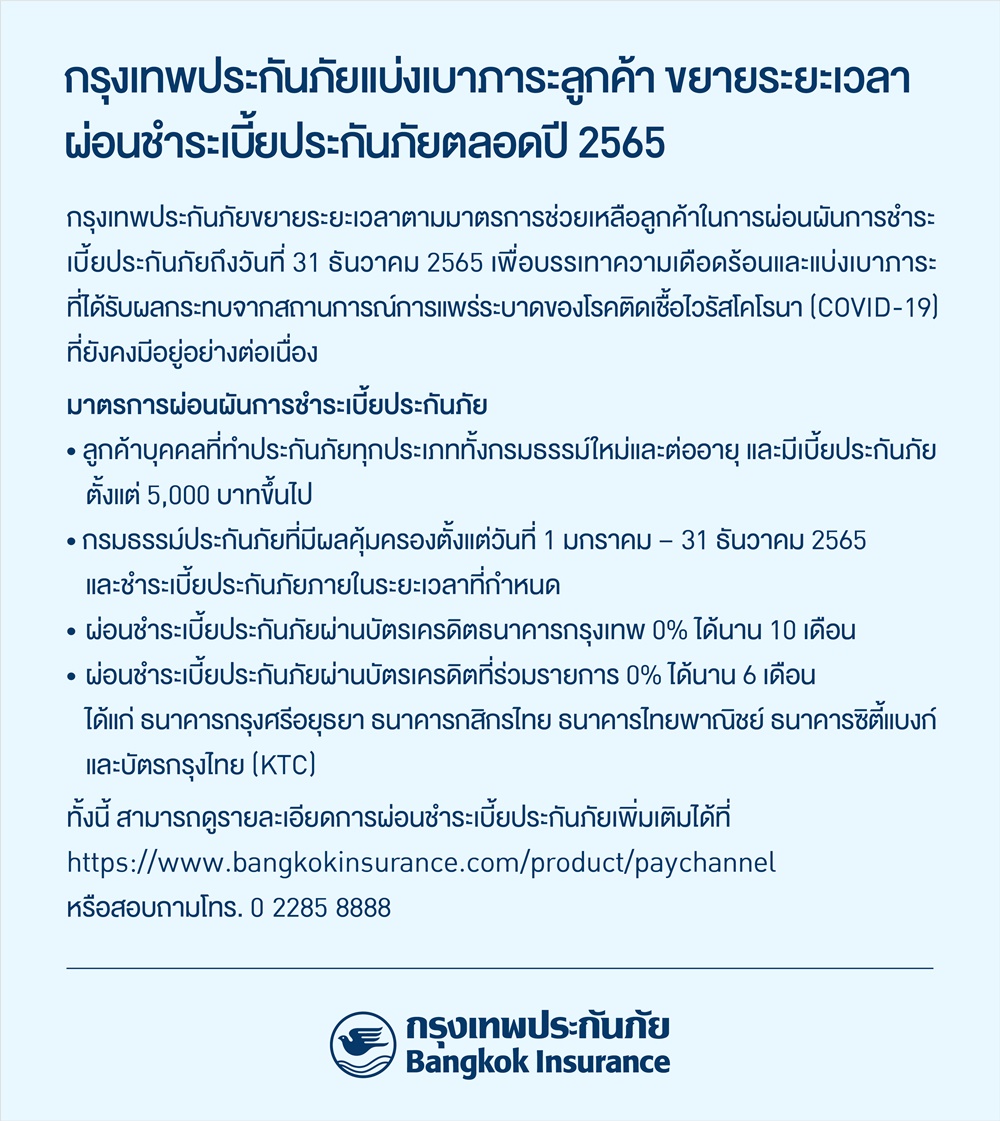 บริษัท กรุงเทพประกันภัย จำกัด (มหาชน) หรือ BKI ขยายระยะเวลาตามมาตรการช่วยเหลือลูกค้าในการผ่อนผันการชำระเบี้ยประกันภัยถึงวันที่ 31 ธันวาคม 2565 จากเดิมที่จะสิ้นสุดในวันที่ 31 ธันวาคม 2564 เพื่อบรรเทาความเดือดร้อนและแบ่งเบาภาระของลูกค้าที่ได้รับผลกระทบจากสถานการณ์การแพร่ระบาดของโรคติดเชื้อไวรัสโคโรนา (COVID-19) ที่ยังคงมีอยู่อย่างต่อเนื่อง