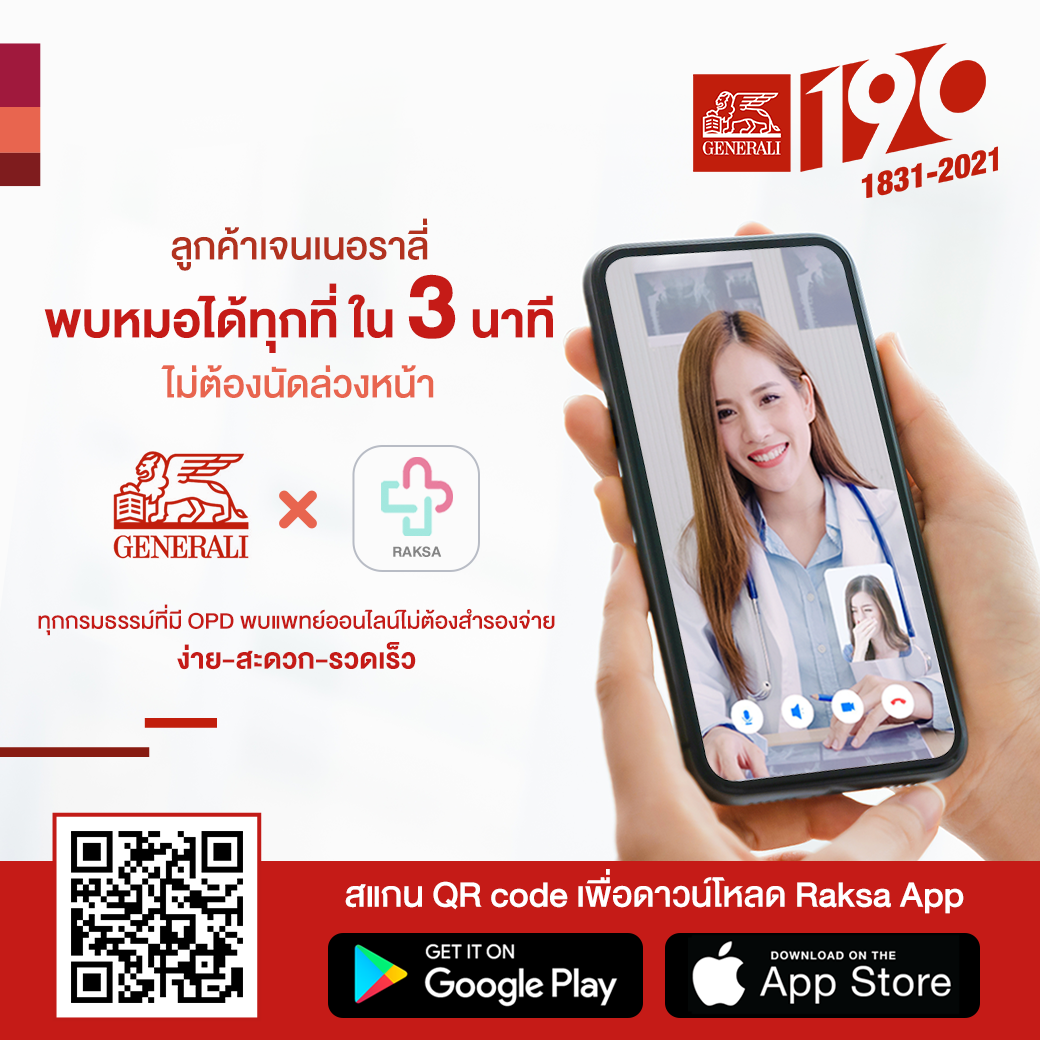 เจนเนอราลี่ ไทยแลนด์ เอาใจกลุ่มลูกค้ารุ่นใหม่ยุค Next Normal ที่ใส่ใจสุขอนามัย ขยายความคุ้มครอง “Telemedicine” พบหมอแบบเรียลไทม์ผ่านแอปพลิเคชัน Raksa สำหรับลูกค้าเจนเนอราลี่ที่ถือกรมธรรม์ที่มีผลประโยชน์ค่ารักษาพยาบาลผู้ป่วยนอก (OPD) ทั้งประกันภัยแบบบุคคลและแบบประกันกลุ่ม ด้วยจุดเด่น ความสะดวกสบาย ไม่ต้องเดินทาง ไม่ต้องสำรองจ่าย ปรึกษาปัญหาสุขภาพกับคุณหมอได้ภายใน 3 นาที ตลอด 24 ชั่วโมง โดยไม่ต้องทำการนัดหมายล่วงหน้า และที่สำคัญสามารถเลือกพบแพทย์ผู้เชี่ยวชาญในสาขาต่างๆโดยไม่จำเป็นต้องมีประวัติกับทางผู้ให้บริการมาก่อน พร้อมเปิดให้บริการแล้วตั้งแต่วันนี้