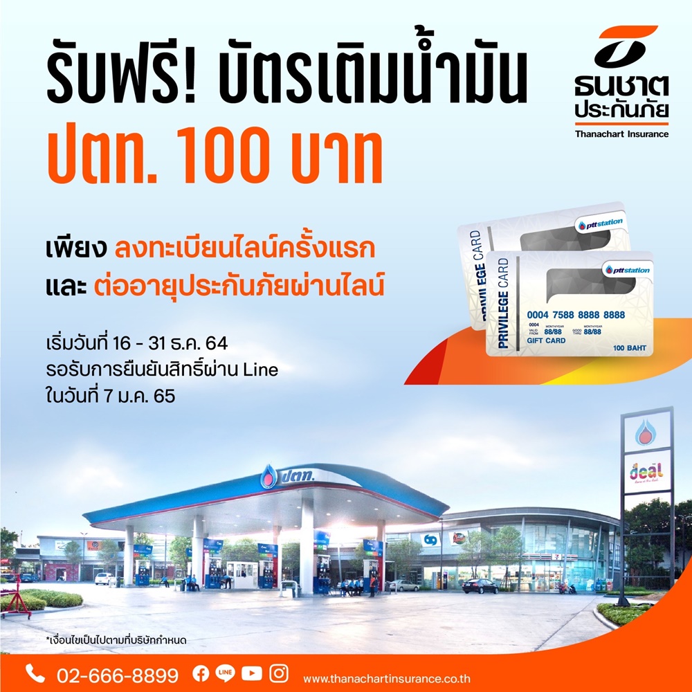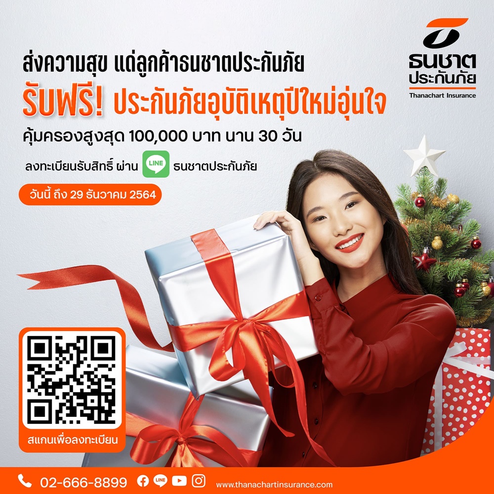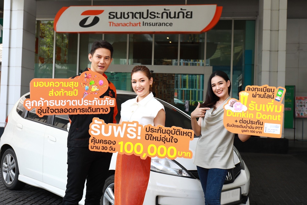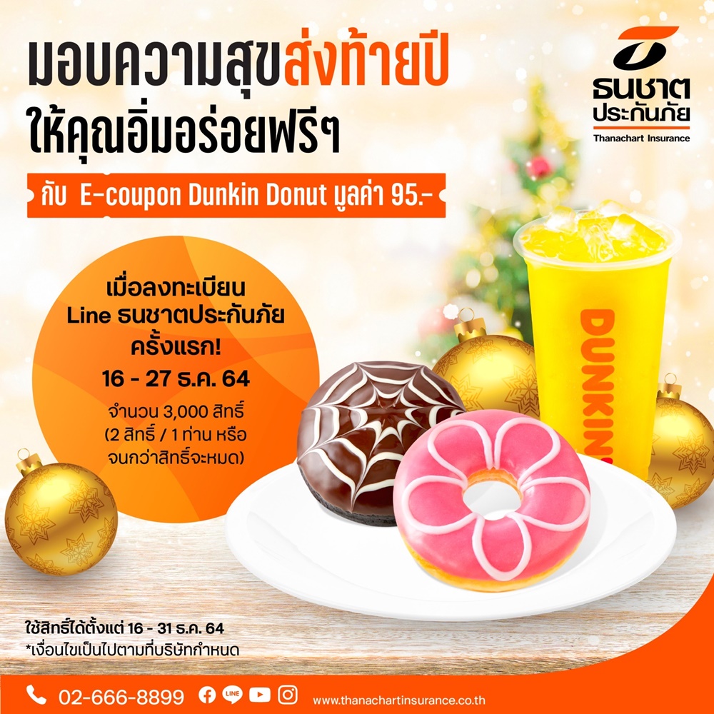 บมจ.ธนชาตประกันภัย มอบความสุขส่งท้ายปีให้ของขวัญแทนใจช่วงเทศกาลปีใหม่แก่ลูกค้า รับฟรี! “ประกันภัยอุบัติเหตุปีใหม่อุ่นใจ” คุ้มครองอุบัติเหตุส่วนบุคคลสูงสุด 1 แสนบาท นาน 30 วัน เพียงลงทะเบียนรับสิทธิ์ผ่าน Line Official Account “ธนชาตประกันภัย” พิเศษ! เมื่อลงทะเบียนเป็นเพื่อนกันบนไลน์ครั้งแรก รับเพิ่ม Dunkin Donut มูลค่า 95 บาท และหากต่อประกันผ่านไลน์จะได้รับเพิ่มบัตรเติมน้ำมัน PTT มูลค่า 100 บาท ตั้งแต่วันนี้ถึง 29 ธันวาคม 2564
