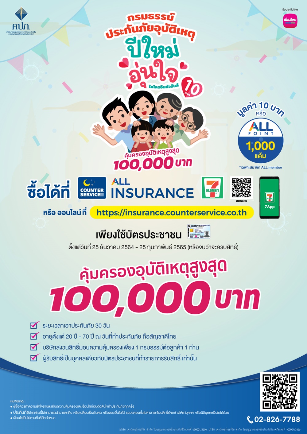 ดร.สุทธิพล ทวีชัยการ เลขาธิการคณะกรรมการกำกับและส่งเสริมการประกอบธุรกิจประกันภัย (คปภ.) พร้อมด้วย นายสาระ ล่ำซำ ประธานเจ้าหน้าที่บริหาร บริษัท เมืองไทยประกันชีวิต จำกัด (มหาชน) และนายวีรเดช อัครผลพานิช รองกรรมการผู้จัดการอาวุโส บริษัท เคาน์เตอร์เซอร์วิส จำกัด ร่วมส่งมอบความอุ่นใจไปยังประชาชนทั่วประเทศในช่วงเทศกาลปีใหม่ประจำปี 2565 เพื่อสอดคล้องกับนโยบายของสำนักงานคณะกรรมการกำกับและส่งเสริมการประกอบธุรกิจประกันภัย (คปภ.) ในการส่งเสริมให้ประชาชนมีหลักประกันความคุ้มครองอุบัติเหตุให้กับตนเองและครอบครัว และสามารถเข้าถึงและใช้ประโยชน์จากระบบการประกันภัยเพื่อบริหารความเสี่ยงจากอุบัติเหตุได้สะดวก เข้าถึงได้ง่าย และรวดเร็วยิ่งขึ้น ผ่าน “กรมธรรม์ประกันภัยอุบัติเหตุปีใหม่อุ่นใจ (ไมโครอินชัวรันส์)” ประกันภัยอุบัติเหตุกลุ่มที่ให้ความคุ้มครองครอบคลุมทั้งด้านชีวิตและค่าชดเชยรายได้ เพื่อมอบความอุ่นใจ