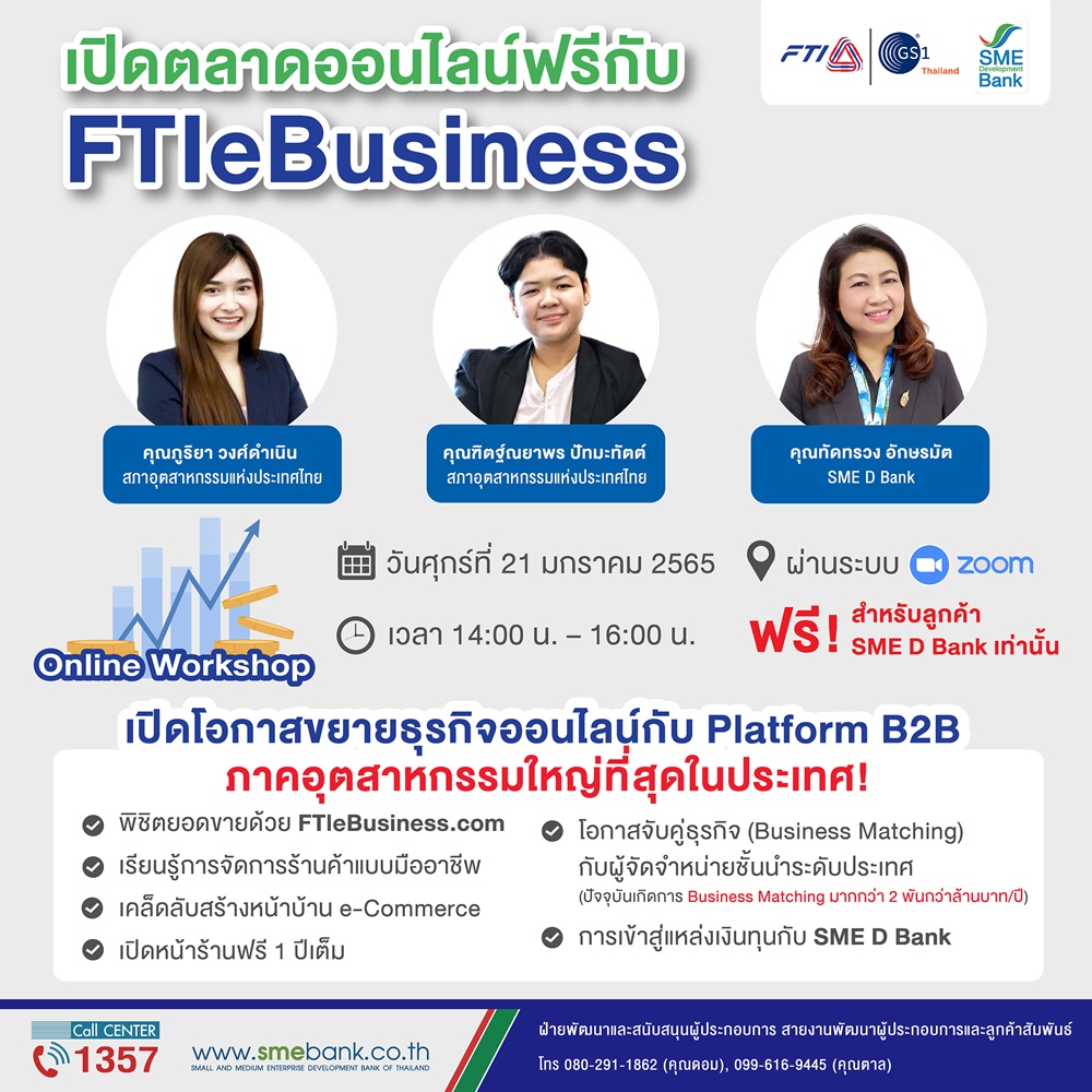 ธนาคารพัฒนาวิสาหกิจขนาดกลางและขนาดย่อมแห่งประเทศไทย (ธพว.) หรือ SME D Bank ร่วมกับสภาอุตสาหกรรมแห่งประเทศไทย (ส.อ.ท.) จัดกิจกรรม “เปิดตลาดออนไลน์ฟรีกับ FTIeBusiness” ในวันศุกร์ที่ 21 มกราคม 2565 ผ่านระบบออนไลน์ Zoom Meeting ตั้งแต่เวลา 14.00-16.00 น. เป็นต้นไป ช่วยเพิ่มโอกาสสร้างรายได้ให้กับลูกค้า SME D Bank ด้วยการจับคู่ธุรกิจกับผู้จัดจำหน่ายชั้นนำระดับประเทศ (B2B) ช่วยธุรกิจเติบโต ก้าวสู่ความสำเร็จ บนแพลทฟอร์มออนไลน์ของ ส.อ.ท. ที่มีภาคอุตสาหกรรมใหญ่ที่สุดในประเทศ ด้วยผู้เข้าชมเว็บไซต์มากกว่า 3.75 ล้านคน มีสมาชิกมากกว่า 200,000 กิจการ และเกิดมูลค่าจากการจับคู่ธุรกิจมากกว่า 2,000 ล้านบาทต่อปี พิเศษ! รับฟังเทคนิคและสิทธิประโยชน์ต่าง ๆ จากผู้เชี่ยวชาญ เช่น การพิชิตยอดขายด้วย FTleBusiness.com, เรียนรู้การจัดการร้านค้าแบบมืออาชีพ, เคล็ดลับสร้างหน้าบ้าน E-Commerce พร้อมเปิดหน้าร้านฟรี 1 ปีเต็ม และการเข้าสู่แหล่งเงินทุนกับ SME D Bank ครอบคลุมทุกกลุ่มธุรกิจ ฟรี! สำหรับลูกค้าธนาคารเท่านั้น สอบถามข้อมูลเพิ่มเติมได้ที่ ฝ่ายพัฒนาและสนับสนุนผู้ประกอบการ โทร. 080-291-1862 , 099-616-9445 หรือ Call Center 1357