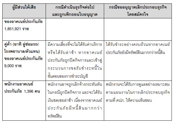 คณะกรรมการบริษัทได้พิจารณาผลกระทบในกรณีดำเนินกิจการของอาคเนย์ประกันภัยต่อไปซึ่งย่อมจะนำไปสู่การมีฐานะหรือการดำเนินงานที่ขาดดวามเหมาะสมจะประกอบธุรกิจประกันวินาศภัยและถูกเพิกถอนใบอนุญาต เปรียบเทียบกับกรณีขออนุญาตเลิกประกอบธุรกิจประกันภัยโดยสมัครใจตามขั้นตอนของกฎหมายประกันวินาศภัยแล้ว เห็นว่ามีข้อพิจารณาที่สำคัญหลายประการที่แสดงให้เห็นว่าการขออนุญาตเลิกประกอบธุรกิจประกันภัยเป็นทางเลือกที่จะเป็นประโยชน์สูงสุดต่อผู้มีส่วนได้เสียทุกฝ่ายที่เกี่ยวข้อง ดังนี้
