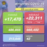 ศูนย์ข้อมูล COVID-19 ของรัฐบาลและศูนย์ EOC กระทรวงสาธารณสุข รายงานสถานการณ์ประจำวันยอดผู้ติดเชื้อโควิด-19 รายใหม่วันที่ 28 กุมภาพันธ์ 2565 พบผู้ติดเชื้อรวม 22,311 ราย จำแนกเป็น
