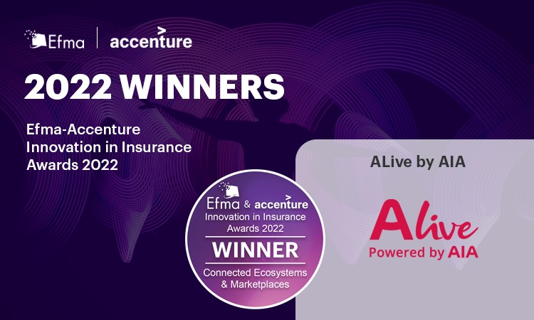 เอไอเอ ประเทศไทย คว้ารางวัลแห่งเกียรติยศ “Efma-Accenture Innovation in Insurance Awards 2022” นวัตกรรมแห่งวงการประกันภัย รางวัลชนะเลิศในสาขา Connected Ecosystems & Marketplaces 2022 Award จากแอปพลิเคชัน ALive Powered by AIA แอปสามัญประจำบ้าน ดูแลครบเรื่องครอบครัว ทั้งเรื่องสุขภาพ การเงิน และการใช้ชีวิต ซึ่งเวทีนี้เป็นการแข่งขันระดับโลกที่นำเสนอแนวคิดและแนวทางในการปฏิบัติใหม่ ๆ ที่ดีที่สุดในการพลิกโฉมการประกันภัยจากผลงานอันโดดเด่น