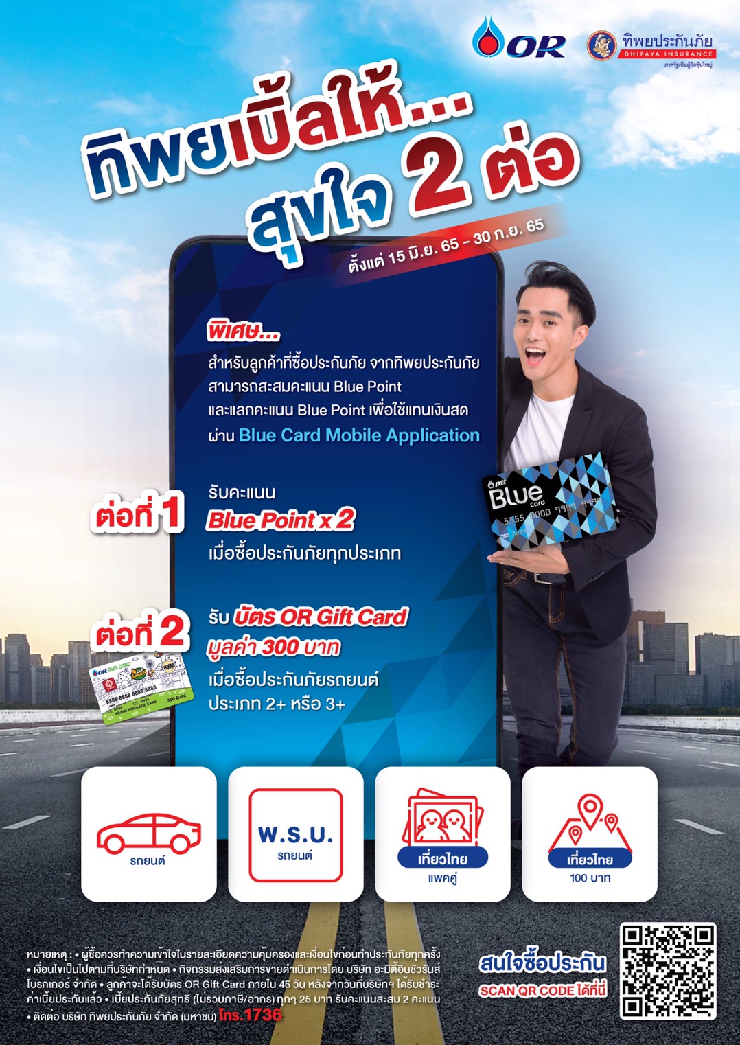 นอกจากนี้ ทิพยประกันภัย ยังได้เตรียมสิทธิพิเศษในช่วงเปิดตัวโครงการ ตั้งแต่วันนี้ – วันที่ 30 กันยายน 2565 สมาชิก Blue Card Mobile Application ที่ซื้อประกันภัยจากทิพยประกันภัย ทุก 25 บาท จะได้รับคะแนน Blue Point 2 คะแนน และเมื่อซื้อประกันภัยรถยนต์ภาคสมัครใจ ประเภท 2+ และ 3+ จะได้รับ OR Gift Card มูลค่า 300 บาท ฟรี สอบถามข้อมูลเพิ่มเติมโทร 1736