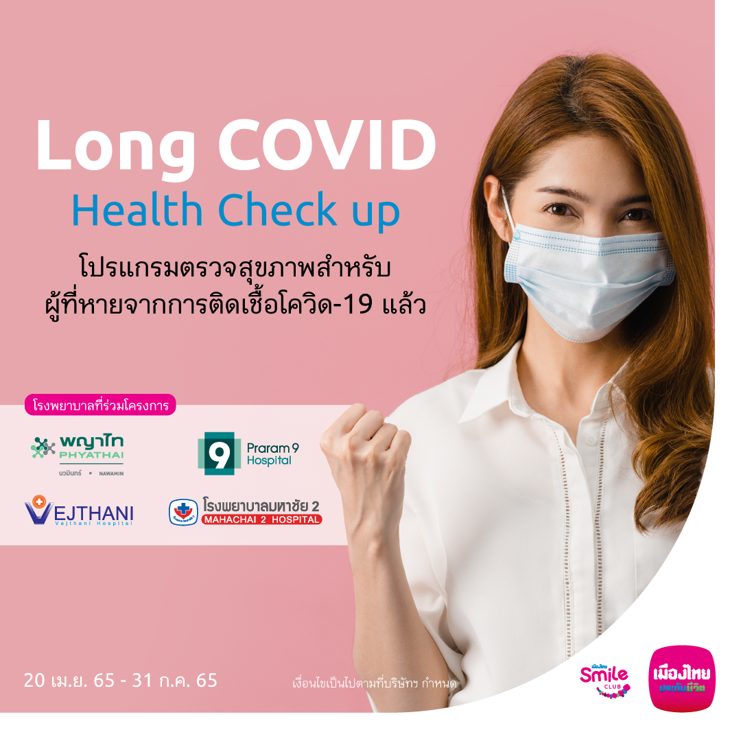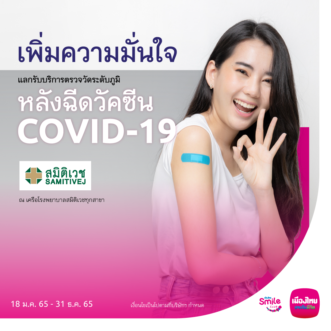นอกจากนี้ ทางเมืองไทยสไมล์คลับยังเพิ่มความมั่นใจในการใช้ชีวิตในช่วงสถานการณ์การแพร่ระบาดของโรคติดเชื้อไวรัสโคโรน่า 2019 (Covid-19) มากขึ้น โดยสมาชิกฯ สามารถแลกคะแนนสะสมเพื่อใช้บริการตรวจวัดระดับภูมิหลังฉีดวัคซีน Covid-19 ณ เครือโรงพยาบาลสมิติเวชทุกสาขา สามารถแลกรับสิทธิ์ได้ตั้งแต่วันนี้ถึงวันที่ 31 ธันวาคม 2565 ซึ่งจะช่วยให้ทราบระดับภูมิตอบสนองของร่างกายภายหลังฉีดวัคซีน Covid-19 หรือสำหรับผู้ที่เคยติดเชื้อไวรัสโคโรนา 2019 (Covid-19) บางรายอาจจะมีอาการที่หลงเหลือหลังติดเชื้อ ทำให้มีสุขภาพไม่แข็งแรงเหมือนเดิม มีภาวะแทรกซ้อนในขณะรับการรักษา สมาชิกฯ สามารถแลกคะแนนสะสม เพื่อรับโปรแกรมตรวจวัดระดับภูมิหลังฉีดวัคซีน Covid-19 หรือโปรแกรมตรวจสุขภาพลองโควิด (Long COVID Health Check up) ในการตรวจประเมินร่างกาย และฟื้นฟูร่างกายภายหลังติดเชื้อไวรัสโคโรนา 2019 (Covid-19) ได้ที่โรงพยาบาลร่วมโครงการ ดังนี้ โรงพยาบาลพญาไท นวมินทร์ โรงพยาบาลพระราม 9 โรงพยาบาลเวชธานี โรงพยาบาลมหาชัย 2 สามารถแลกรับสิทธิ์ได้ตั้งแต่วันนี้ถึงวันที่ 31 ธันวาคม 2565 สมาชิกเมืองไทยสไมล์คลับสามารถแลกคะแนนสะสม Smile Point ได้ที่แอปพลิเคชัน MTL Click และศูนย์บริการลูกค้าเมืองไทยประกันชีวิต