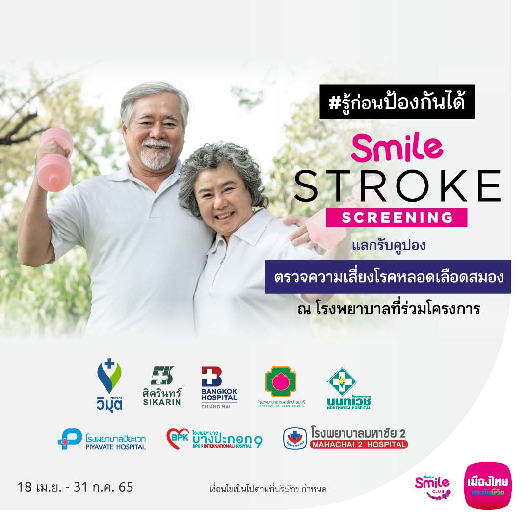 ทางเมืองไทยสไมล์คลับ ยังมีการส่งเสริมด้านการเตรียมความพร้อมในการป้องกันก่อนเกิดปัญหาด้านสุขภาพ โดยการร่วมมือกับโรงพยาบาลชั้นนำ อาทิ โรงพยาบาลวิมุต โรงพยาบาลศิครินทร์ โรงพยาบาลกรุงเทพ เชียงใหม่ โรงพยาบาลอุบลรักษ์ ธนบุรี โรงพยาบาลนนทเวช โรงพยาบาลปิยะเวท โรงพยาบาลบางปะกอก 9 อินเตอร์เนชั่นแนล และโรงพยาบาลมหาชัย 2 จัดกิจกรรมให้สมาชิกฯ ได้แลกคะแนนสะสม เพื่อรับบัตรตรวจสุขภาพ Smile Stroke Screening โปรแกรมตรวจความเสี่ยงโรคหลอดเลือดสมอง เพื่อคัดกรองและป้องกันความเสี่ยงในการเกิดโรคอัมพฤกษ์ อัมพาต ซึ่งสาเหตุหลักในการเกิดมาจากโรคหลอดเลือดสมอง สมาชิกเมืองไทยสไมล์คลับสามารถแลกคะแนนสะสม Smile Point ได้ที่แอปพลิเคชัน MTL Click และศูนย์บริการลูกค้าเมืองไทยประกันชีวิต โดยสามารถแลกรับสิทธิ์ได้ตั้งแต่วันนี้ถึงวันที่ 31 กรกฏาคม 2565