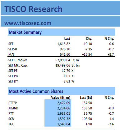 SET เมื่อวานปิดต่ำกว่าระดับ 1620 มีโอกาสปรับลงต่อ ทดสอบระดับ 1600 หรือต่ำกว่า เทรดดิ้งระยะสั้น เน้นการรอจังหวะเข้าซื้อช่วงอ่อนตัว / พอร์ตลงทุน เน้นหาจังหวะสะสมช่วงตลาดอ่อนตัว ไม่ต้องรีบร้อน