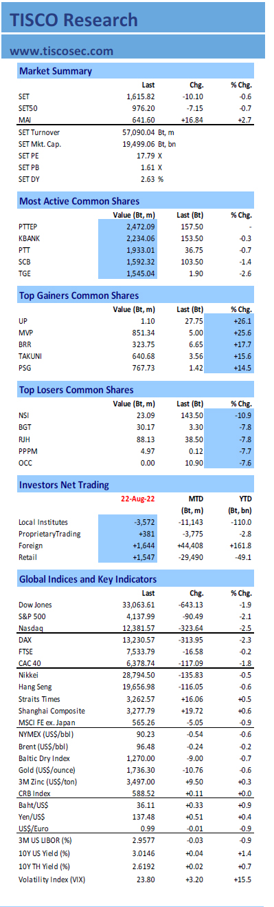 หุ้นโลกเมื่อวาน (22 ส.ค.) ปรับลงต่อ โดยหุ้นสหรัฐฯ ร่วงกว่า 2% หลัง 10Y US Bond Yield ขยับขึ้นต่อ 4 bps มาที่ 3.01% ขณะที่ US Dollar Index พุ่งแรงขึ้นมาที่แตะระดับ 109 จุด ซึ่งเป็นระดับสูงสุดในรอบ 20 ปี กังวล FED จะเร่งขึ้นดบ.มากกว่าคาดเพื่อสกัดเงินเฟ้อ รอถ้อยแถลงปธ.FED ในการประชุมประจำปีที่ Jackson Hole วันศุกร์นี้ ด้านราคาน้ำมันดิบ WTI อ่อนลงเล็กน้อย -0.54 $ ยุติขึ้น 3 วันติด แต่ยังคงปิดเหนือระดับ 90 $/bbl หลังรมต.พลังงานของซาอุฯ ระบุกลุ่ม OPEC+ พร้อมปรับลดกำลังการผลิตเพื่อรับมือความท้าทายในตลาด มอง SET มีแนวโน้มแกว่งปรับฐานต่อ จาก Bond Yield ปรับขึ้น และเงินดอลลาร์ฯ แข็งค่า รอความชัดเจนนโยบายการเงินจากปธ.FED ช่วงปลายสัปดาห์นี้ ขณะที่เงินบาทอ่อนค่าต่อแตะระดับ 36.1 บ./$ นอกจากเงินดอลลาร์ฯ แข็งค่าแล้ว การเมืองไม่นิ่งด้วย โดยวันนี้จะมี 4 ม็อบนัดชุมนุมจากปมนายกฯ ดำรงตำแหน่งครบ 8 ปี วันนี้แนะนำติดตามการประชุมครม. และ PMI ภาคการผลิตและภาคบริการของปท.สำคัญ แนวรับ 1600-1605 แนวต้าน 1620-25 ?