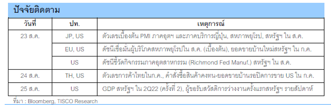 • ประเด็นหุ้นน่าสนใจ Fundamental Pick KTB – ผู้บริหารคาดว่าจะสามารถรักษาต้นทุนเครดิตในระดับเดียวกับช่วงครึ่งปีแรก และสัดส่วนต้นทุนต่อรายได้มีแนวโน้มจะลดลงจากรายได้ฟื้นตัวแข็งแกร่ง, เรามีการปรับลดต้นทุนเครดิตและอัตราการเติบโตของค่าใช้จ่ายในการดำเนินงานลง ส่งผลให้กำไรปี 2022-24F ปรับขึ้น 20%, 18% และ 16% ตามลำดับ, ปรับเป้าพื้นฐานขึ้นจาก 15 บ. เป็น 18.5 บ. ยังคงคำแนะนำ “ซื้อ” / หุ้นงบดีกว่าคาด ตลาดมีโอกาสปรับเป้ากำไรขึ้น AH, AMATA, PR9, SUSCO, TFG, TPIPL / หุ้นพื้นฐานดีขนาดใหญ่ที่เงินต่างชาติไหลเข้า เด่น KBANK, SCB, PTT, BANPU, BDMS, AOT, TRUE, INTUCH / หุ้นที่แนวโน้มกำไร H2 > H1 และมีประเด็นบวกระยะสั้น BAM, BGRIM, CPALL, CBG, CENTEL, MINT / หุ้นขนาดกลางถึงใหญ่ที่ Laggards SET50 - CPALL, CBG, EA, GULF / SET100 – ACE, BCPG, STEC / หุ้นรอข่าวดีประกาศจ่ายเงินปันผลในช่วงครึ่งหลัง ส.ค. BANPU, BCP, KKP, SUSCO, TTW / นทท.ต่างชาติเดือน ก.ค. ทะลุ 1 ล้านคนเป็นเดือนแรก เป็นผลดีต่อหุ้นเกี่ยวข้องการท่องเที่ยว ชอบ AOT, CENTEL, MINT, CPALL, CRC / KBANK ได้เข้าคำนวณดัชนี MSCI ใช้ราคาปิด 31 ส.ค. / ราคาน้ำมัน WTI พักตัวลงมาต่ำกว่า 90$ เป็นจังหวะเก็งกำไรหุ้นที่เคยถูกกดดันก่อนหน้านี้ เด่น AAV, BGRIM, GPSC, SCGP / คนละครึ่งเฟส 5 และการปรับขึ้นค่าแรงขั้นต่ำ ดีต่อกำลังซื้อของปชช. ชอบ CPALL, CRC, AEONTS, CBG / Top Picks ครึ่งปีหลัง Big Cap - BBL, BDMS, BEM, IVL, MAKRO, MINT Mid to Small Cap - AEONTS, AP, CENTEL, CK, SAPPE, SMPC