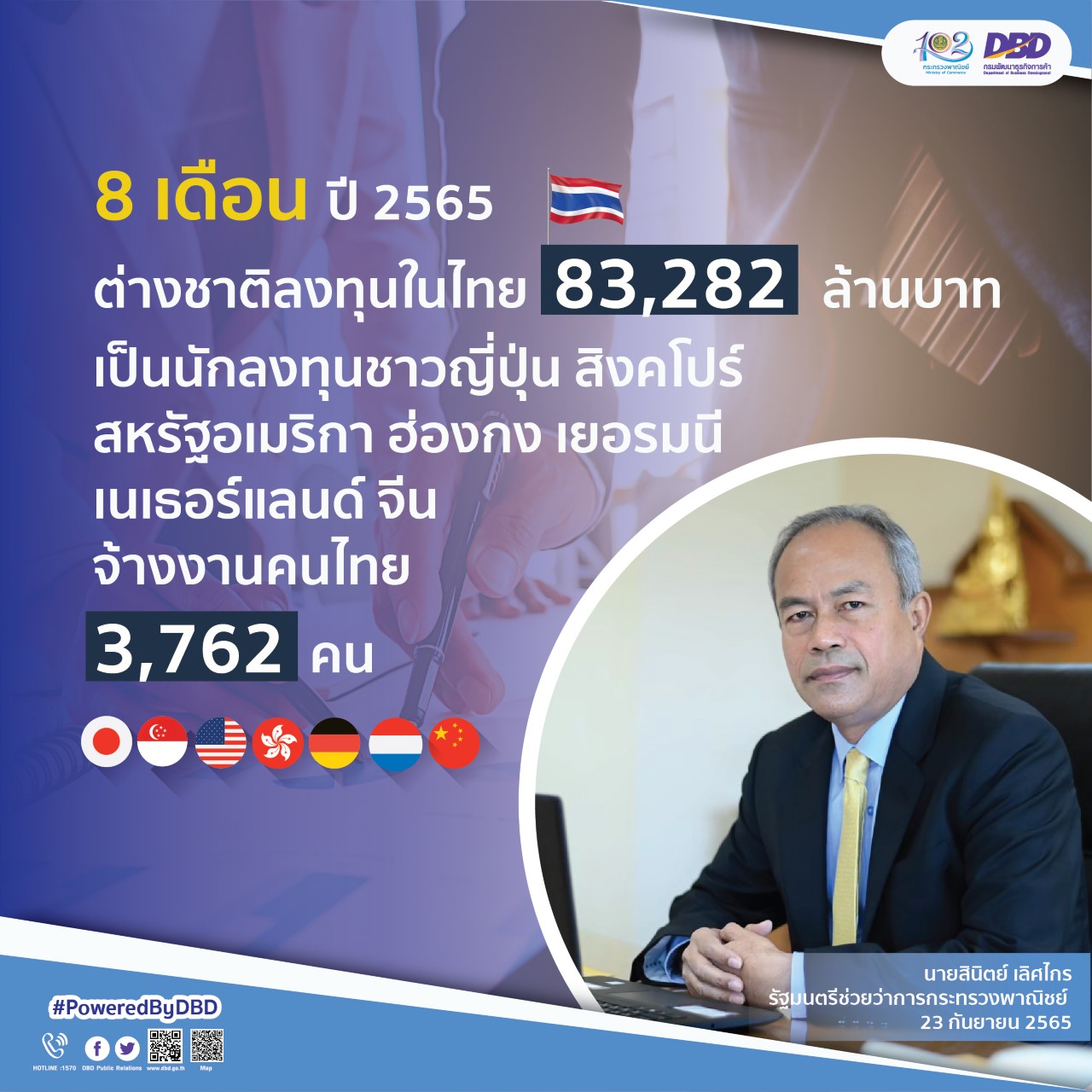 นายสินิตย์ เลิศไกร รัฐมนตรีช่วยว่าการกระทรวงพาณิชย์ เปิดเผยว่า อธิบดีกรมพัฒนาธุรกิจการค้า (นายทศพล ทังสุบุตร) ในฐานะเลขานุการคณะกรรมการการประกอบธุรกิจของคนต่างด้าว รายงานให้ทราบว่า ภายใต้พระราชบัญญัติการประกอบธุรกิจของคนต่างด้าว พ.ศ.2542 ช่วง 8 เดือนแรก (ม.ค. - ส.ค.) ปี 2565 มีการอนุญาตให้คนต่างชาติเข้ามาลงทุนประกอบธุรกิจในประเทศไทย จำนวน 381 ราย โดยเป็นการลงทุนผ่านช่องทางการขอรับใบอนุญาตประกอบธุรกิจของคนต่างด้าว และการขอหนังสือรับรองการประกอบธุรกิจของคนต่างด้าว แบ่งเป็น ใบอนุญาตประกอบธุรกิจ จำนวน 141 ราย และหนังสือรับรองประกอบธุรกิจ จำนวน 240 ราย โดยมีเม็ดเงินลงทุนทั้งสิ้น 83,282 ล้านบาท จ้างงานคนไทยกว่า 3,762 คน โดยชาวต่างชาติที่เข้ามาลงทุนมากที่สุด 3 อันดับแรก ได้แก่ ญี่ปุ่น 96 ราย (ร้อยละ 25) เงินลงทุน 32,897 ล้านบาท สิงคโปร์ 64 ราย (ร้อยละ 17) เงินลงทุน 10,665 ล้านบาท สหรัฐอเมริกา 49 ราย (ร้อยละ 13) เงินลงทุน 3,277 ล้านบาท ฮ่องกง 28 ราย (ร้อยละ 7.4) เงินลงทุน 7,788 ล้านบาท เยอรมนี 17 ราย (ร้อยละ 4.5) เงินลงทุน 1,203 ล้านบาท เนเธอร์แลนด์ 16 ราย (ร้อยละ 4.2) เงินลงทุน 4,907 ล้านบาท และ จีน 16 ราย (ร้อยละ 4.2) เงินลงทุน 14,719 ล้านบาท