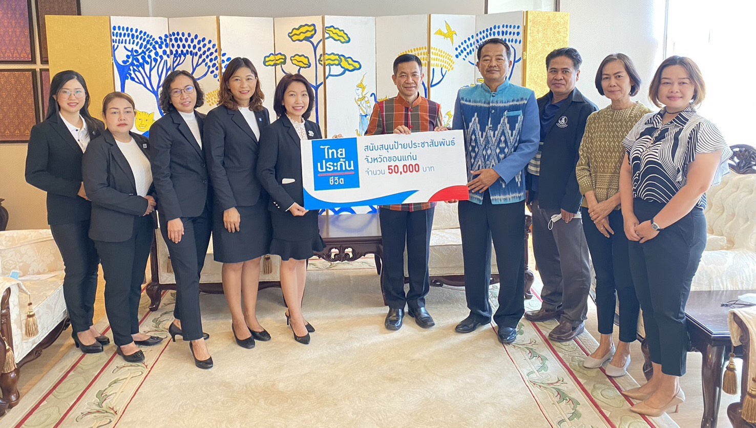 ?นายพันธ์เทพ เสาโกศล รองผู้ว่าราชการจังหวัดขอนแก่น รับมอบเงินสนับสนุนการจัดทำป้ายประชาสัมพันธ์ จังหวัดขอนแก่น จำนวน 50,000 บาท จาก นางสกุณี อ้วนหวัน ผู้จัดการฝ่ายขยายงานภูมิภาค 133 ผู้แทนบริษัท ไทยประกันชีวิต จำกัด (มหาชน) สำหรับใช้ในการประชาสัมพันธ์กิจกรรมสำคัญของจังหวัด รวมถึงรณรงค์สร้างจิตสำนึกในเรื่องต่างๆ ให้กับประชาชนในจังหวัดขอนแก่น โดยบริษัทฯ ให้การสนับสนุนต่อเนื่องเป็นปีที่ 24 ณ ศาลากลางจังหวัดขอนแก่น