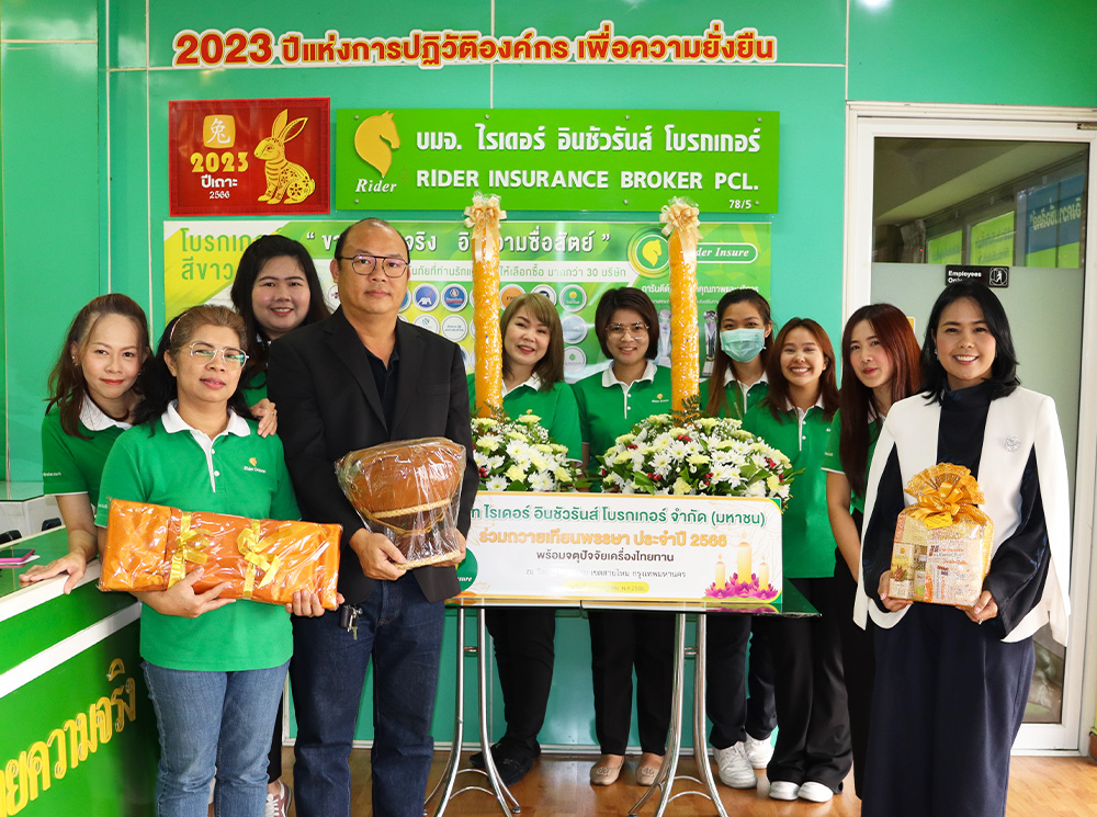 บริษัท ไรเดอร์ อินชัวรันส์ โบรกเกอร์ จำกัด(มหาชน) นำโดย คุณพร้อมพร จินดาวงค์ เนตรหาญ รองประธานเจ้าหน้าที่บริหาร (คนที่ 6 จากซ้าย) คุณอนุชิต กูรมาภิรักษ์ ประธานเจ้าหน้าที่ด้านเทคโนโลยีสารสนเทศ (คนที่ 3 จากขวา) พร้อมพนักงาน ถวายเทียนพรรษา พร้อมปัจจัยไทยธรรม ณ วัดอมราวราราม เขตสายไหม กรุงเทพฯ เพื่อเป็นการรักษาขนบธรรมเนียมประเพณีที่งดงามของไทย เนื่องในเทศกาลวันเข้าพรรษา ประจำปี 2566 อีกทั้งยังเป็นการปลูกฝังค่านิยมอันดีงาม ตามแนวทางของบริษัทฯ ที่ให้ความสำคัญกับกิจกรรมทางศาสนา เพื่อสืบทอดพระพุทธศาสนาและสืบสานวัฒนธรรมประเพณีอันดีงามสืบต่อไป เมื่อเร็วๆ นี้