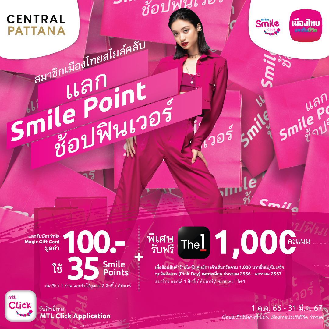 นายสาระ ล่ำซำ ประธานเจ้าหน้าที่บริหาร บริษัท เมืองไทยประกันชีวิต จำกัด (มหาชน)เปิดเผยว่า เพื่อเป็นการส่งมอบความสุขและรอยยิ้มในช่วงเทศกาลส่งท้ายปี เมืองไทยประกันชีวิต ร่วมกับ บริษัท เซ็นทรัลพัฒนา จำกัด (มหาชน) จัดแคมเปญ “แลก Smile Point ช้อปฟินเวอร์” ให้สมาชิกฯ ได้ฟินสุด ๆ พร้อมความพิเศษรับฟรีคะแนน The1 Point 1,000 คะแนน ที่ศูนย์การค้าเซ็นทรัลทุกสาขาทั่วประเทศ (เงื่อนไขเป็นไปตามที่กำหนด)