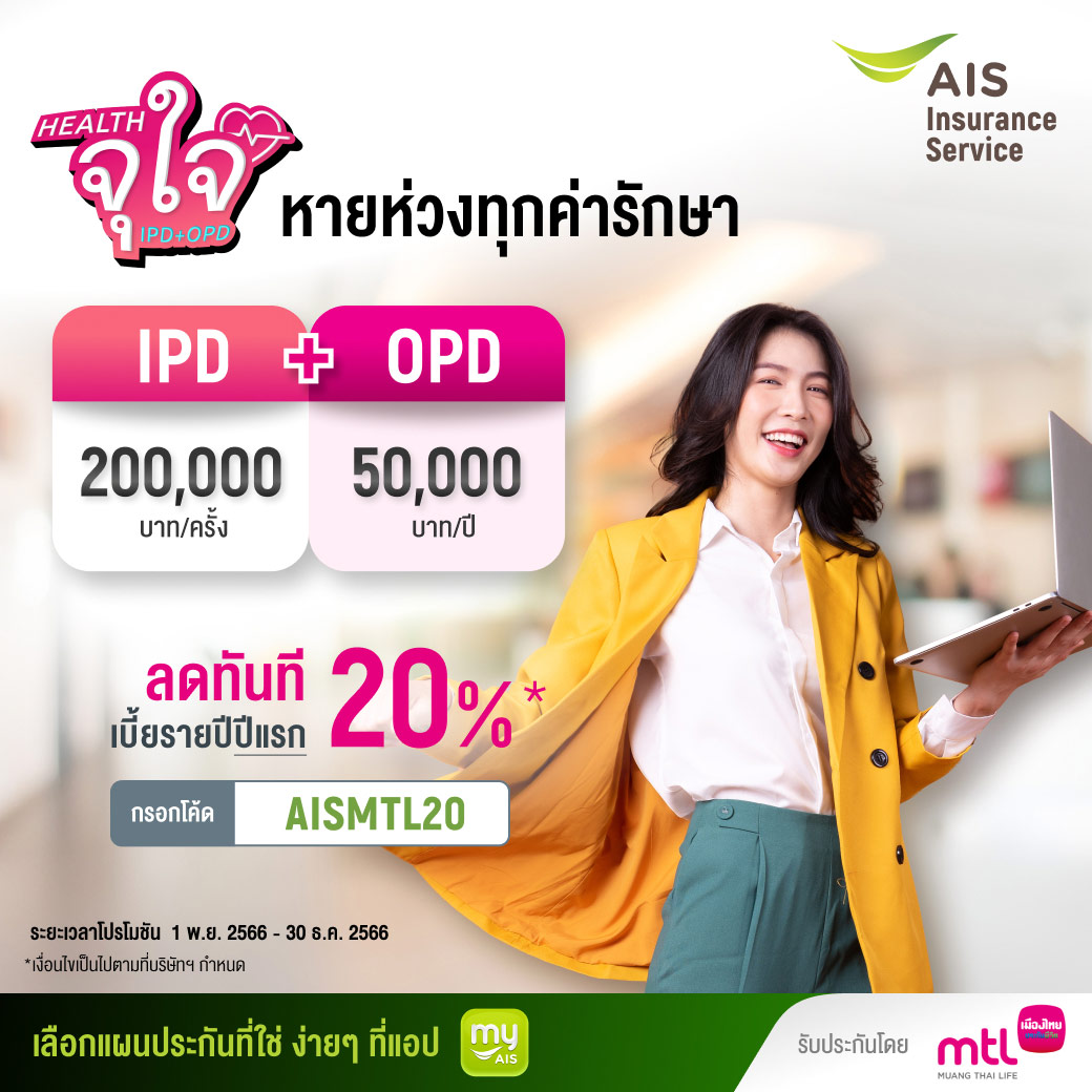 เมืองไทยประกันชีวิต จับมือ AIS มอบความสุขส่งท้ายปีแก่ลูกค้า AIS Serenade ส่งโครงการ “Health จุใจ IPD+OPD” ช่วยเพิ่มความอุ่นใจ หายห่วงเรื่องค่ารักษา เปิดประสบการณ์ใหม่ประกันสุขภาพออนไลน์ และสิทธิพิเศษโดนใจ เพียงกรอกโค้ด “AISMTL20” พร้อมรับความสุขและความอุ่นใจ ได้แล้วตั้งแต่ 1 พ.ย. - 30 ธ.ค. 2566
