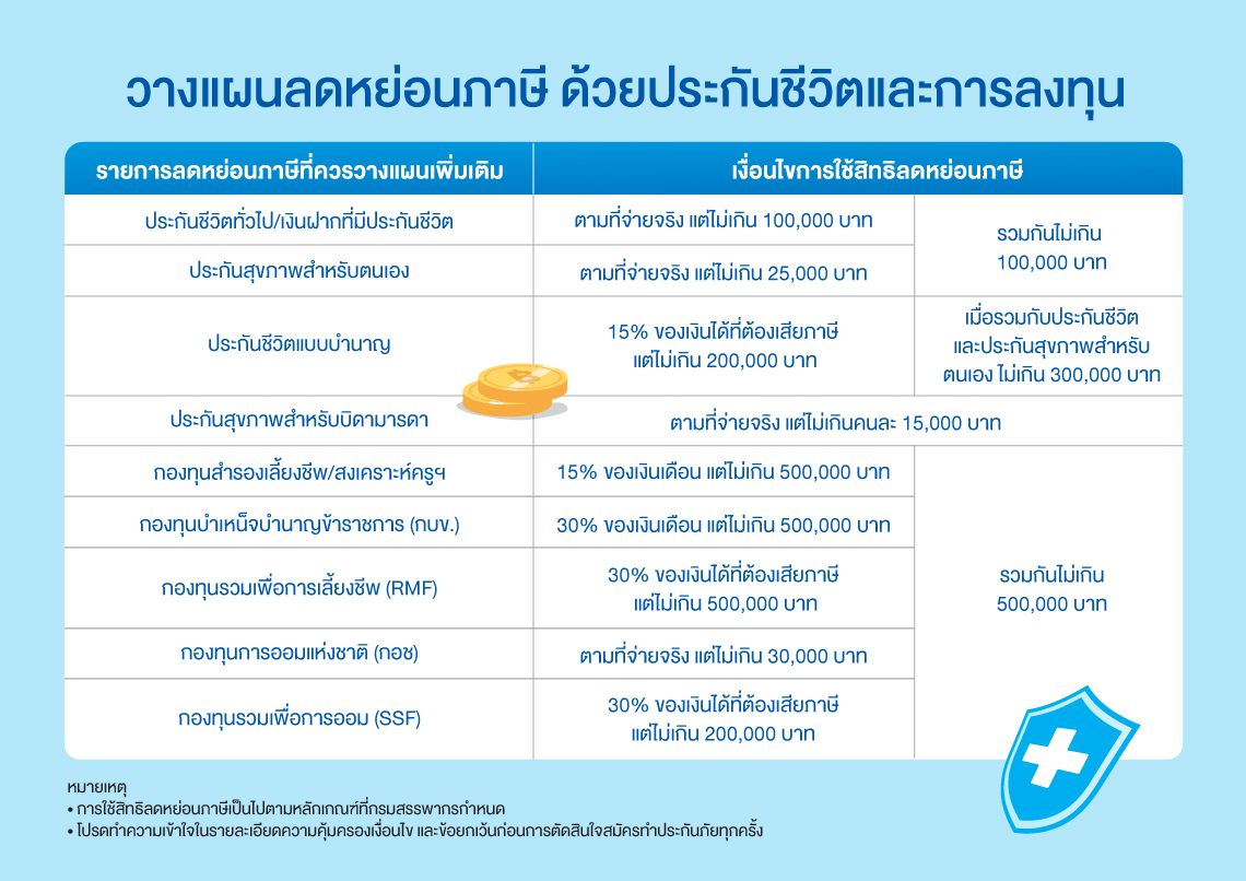 ข้อดีของการวางแผนด้วยประกันชีวิตนอกจากจะลดหย่อนภาษีได้แล้ว ยังมีความเสี่ยงต่ำ และกรมธรรม์บางประเภทยังได้รับผลตอบแทนที่แน่นอนอีกด้วย นับเป็นทางเลือกที่ดีทางหนึ่งสำหรับการวางแผนเพื่อการลดหย่อนภาษีไปพร้อมกับเป้าหมายทางการเงิน