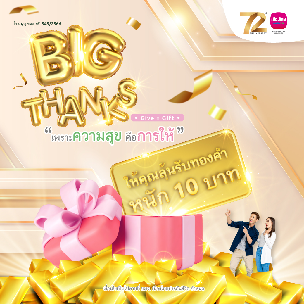 โดยในปีนี้ตั้งแต่ช่วงเดือนมีนาคมเป็นต้นมา บริษัทฯ ได้จัดแคมเปญสุดพิเศษเพื่อเป็นของขวัญแทน คำขอบคุณให้กับลูกค้าทุกท่านโดยเฉพาะ กับแคมเปญ “MTL Big Thanks...GIVE = GIFT เพราะความสุขคือการให้” มอบสิทธิ์ลุ้นรับรางวัลใหญ่ รางวัลที่ 1 ทองคำแท่งหนัก 10 บาท และรางวัลอื่นๆ อีกมากมายรวมมูลค่ากว่า 800,000 บาท ซึ่งลูกค้าสามารถเข้าร่วมสนุกเพื่อลุ้นรับรางวัลผ่านหลากหลายกิจกรรมที่บริษัทฯ ได้สร้างสรรค์ขึ้น อาทิ การสมัครใช้บริการการยืนยันตัวตนด้วยเสียง (Voice Biometrics) ได้สำเร็จ การส่งประเมินความพึงพอใจผ่านการใช้บริการช่องทางต่างๆ ของบริษัทฯ การสมัครรับเอกสารจากบริษัทฯ ในรูปแบบอิเล็กทรอนิกส์ การทำธุรกรรมผ่านระบบบริการข้อมูลทางโทรศัพท์อัตโนมัติ โดยลูกค้าที่ใช้บริการในช่องทางต่างๆ ที่บริษัทฯ กำหนด จะได้รับสลากเพื่อนำมาลุ้นรางวัลใหญ่ของเรา ตั้งแต่วันที่ 15 มีนาคม 2566 ถึง 31 ธันวาคม 2566 จับสลากรางวัลภายในวันที่ 21 กุมภาพันธ์ 2567 ณ เมืองไทยประกันชีวิต สำนักงานใหญ่ และประกาศรายชื่อผู้ได้รับรางวัลในวันที่ 28 กุมภาพันธ์ 2567 ที่เว็บไซต์ www.muangthai.co.th