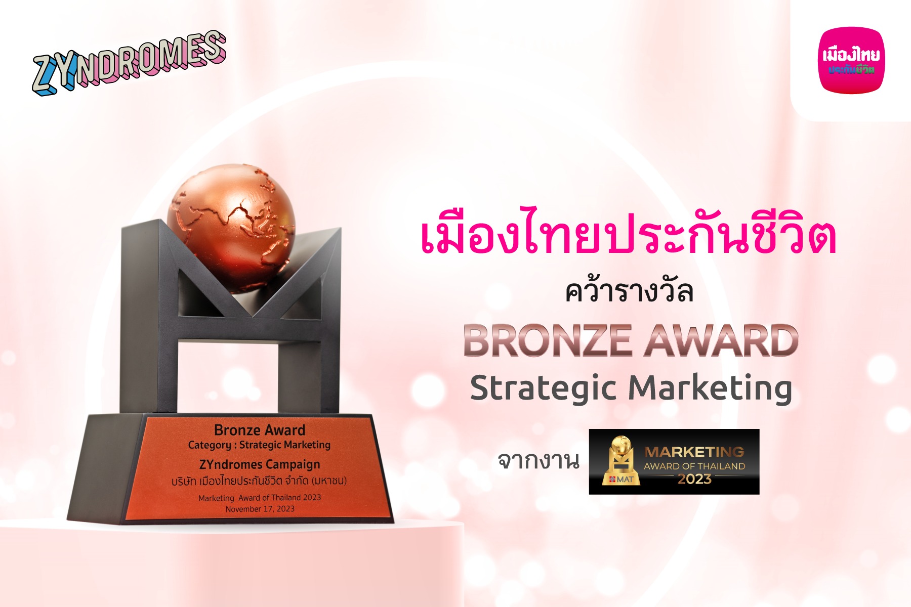 เมืองไทยประกันชีวิต ปลื้มรับรางวัลสุดยอดผู้นำการตลาดแห่งปี “MAT AWARD 2023” ในหมวดแคมเปญการตลาดที่มีความเป็นเลิศด้านกลยุทธ์ ระดับ Bronze ตอกย้ำความแรงของแคมเปญ “ZYndromes” ตอบโจทย์ความคุ้มครองสุขภาพสำหรับคนเจนใหม่อย่างเข้าใจและเข้าถึงได้