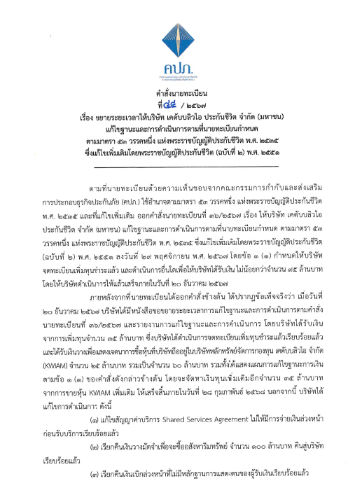ตามที่นายทะเบียนด้วยความเห็นชอบจากคณะกรรมการกำกับและส่งเสริมการประกอบธุรกิจประกันภัย (บอร์ด คปภ.) สั่งให้บริษัท เคดับบลิวไอ ประกันชีวิต จำกัด (มหาชน) จดทะเบียนเพิ่มทุนชำระแล้วและดำเนินการอื่นใด เพื่อให้บริษัทได้รับเงิน ไม่น้อยกว่าจำนวน 95 ล้านบาท โดยให้บริษัทดำเนินการให้แล้วเสร็จภายในวันที่ 20 ธันวาคม 2567 ตามข้อ 1 (1) ของคำสั่งนายทะเบียนที่ 36/2567 ลงวันที่ 29 พฤศจิกายน 2567