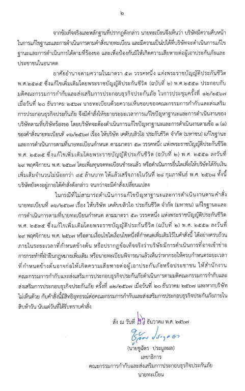 จากข้อเท็จจริงและหลักฐานที่ปรากฏดังกล่าว นายทะเบียนจึงเห็นว่า บริษัทมีความคืบหน้าในการแก้ไขฐานะและการดำเนินการตามคำสั่งนายทะเบียน และมีความเป็นไปได้ที่บริษัทจะดำเนินการแก้ไขฐานะและการดำเนินการได้ตามที่ร้องขอ ดังนั้น เพื่อป้องกันมิให้เกิดความเสียหายต่อผู้เอาประกันภัยและประชาชนในอนาคต จึงมีคำสั่งให้ขยายระยะเวลาการแก้ไขปัญหาฐานะและการดำเนินการของบริษัทตามที่บริษัทร้องขอ โดยบริษัทจะต้องดำเนินการแก้ไขปัญหาฐานะและการดำเนินการตามข้อ 1 (1) ของคำสั่งนายทะเบียนที่ 36/2567 ลงวันที่ 29 พฤศจิกายน 2567 โดยเพิ่มทุนจดทะเบียนชำระแล้ว หรือดำเนินการอื่นใด เพื่อให้บริษัทได้รับเงินเพิ่มเติมจำนวนไม่น้อยกว่า 95 ล้านบาท ให้แล้วเสร็จภายในวันที่ 28 กุมภาพันธ์ 2568 ทั้งนี้บริษัทยังคงอยู่ภายใต้คำสั่งดังกล่าว จนกว่าจะมีคำสั่งเปลี่ยนแปลง
