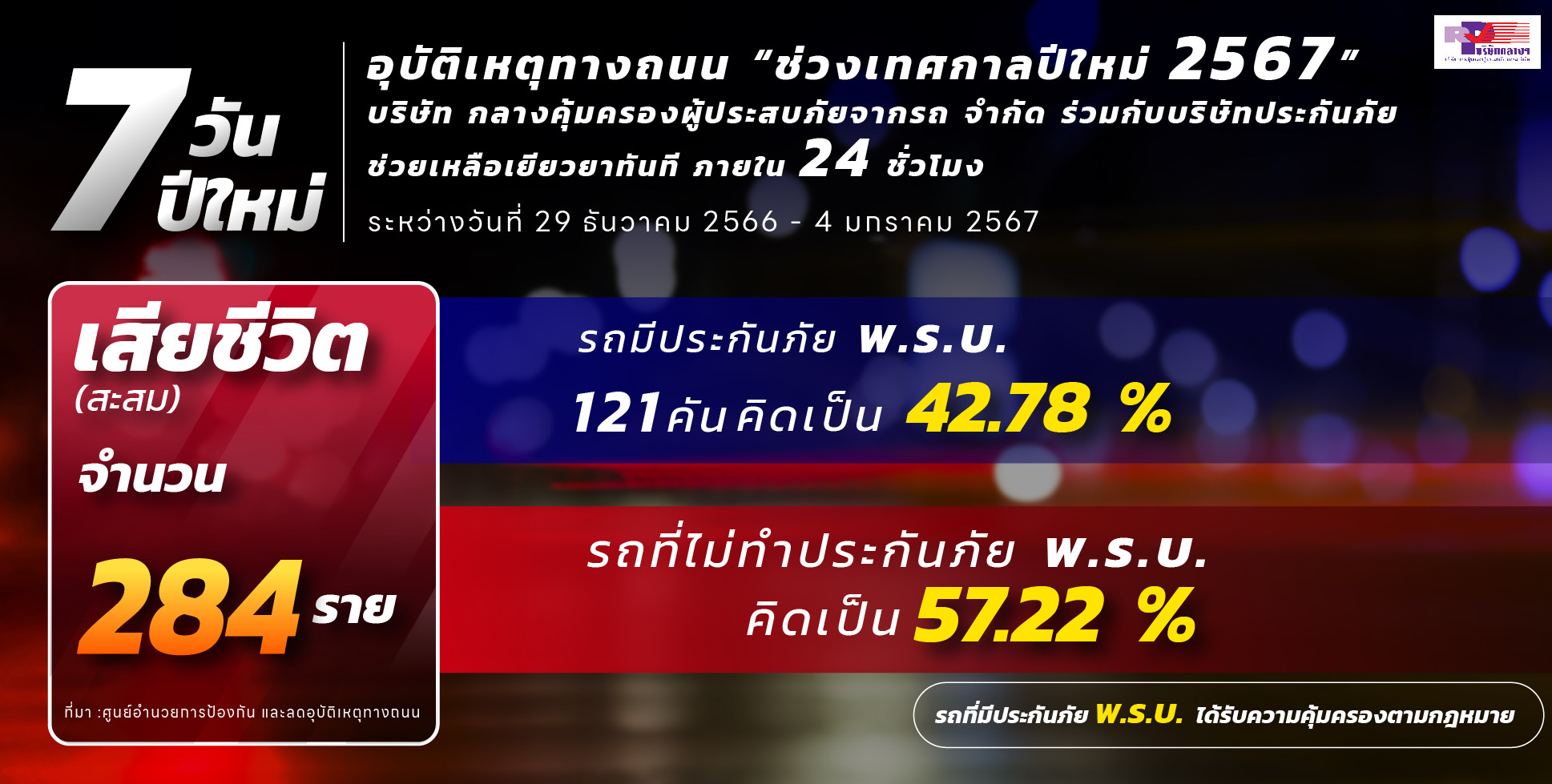 ตามที่ศูนย์อำนวยการป้องกันและลดอุบัติเหตุทางถนน ได้สรุปสถิติอุบัติเหตุทางถนนในช่วงเทศกาลปีใหม่ 2567 “ขับขี่ปลอดภัย เมืองไทยไร้อุบัติเหตุ” ตลอด 7 วัน ระหว่างวันที่ 29 ธันวาคม 2566 ถึงวันที่ 4 มกราคม 2567 พบว่ามีการเกิดอุบัติเหตุ รวม 2,288 ครั้ง ผู้เสียชีวิต 284 ราย ผู้บาดเจ็บ 2,307 คน โดยสาเหตุหลักที่ทำให้เกิดอุบัติเหตุ ได้แก่ ขับรถเร็วเกินกว่ากฎหมายกำหนด,ดื่มแล้วขับ และรถจักรยานยนต์เป็นพาหนะที่เกิดอุบัติเหตุสูงสุดถึงร้อยละ 86.30