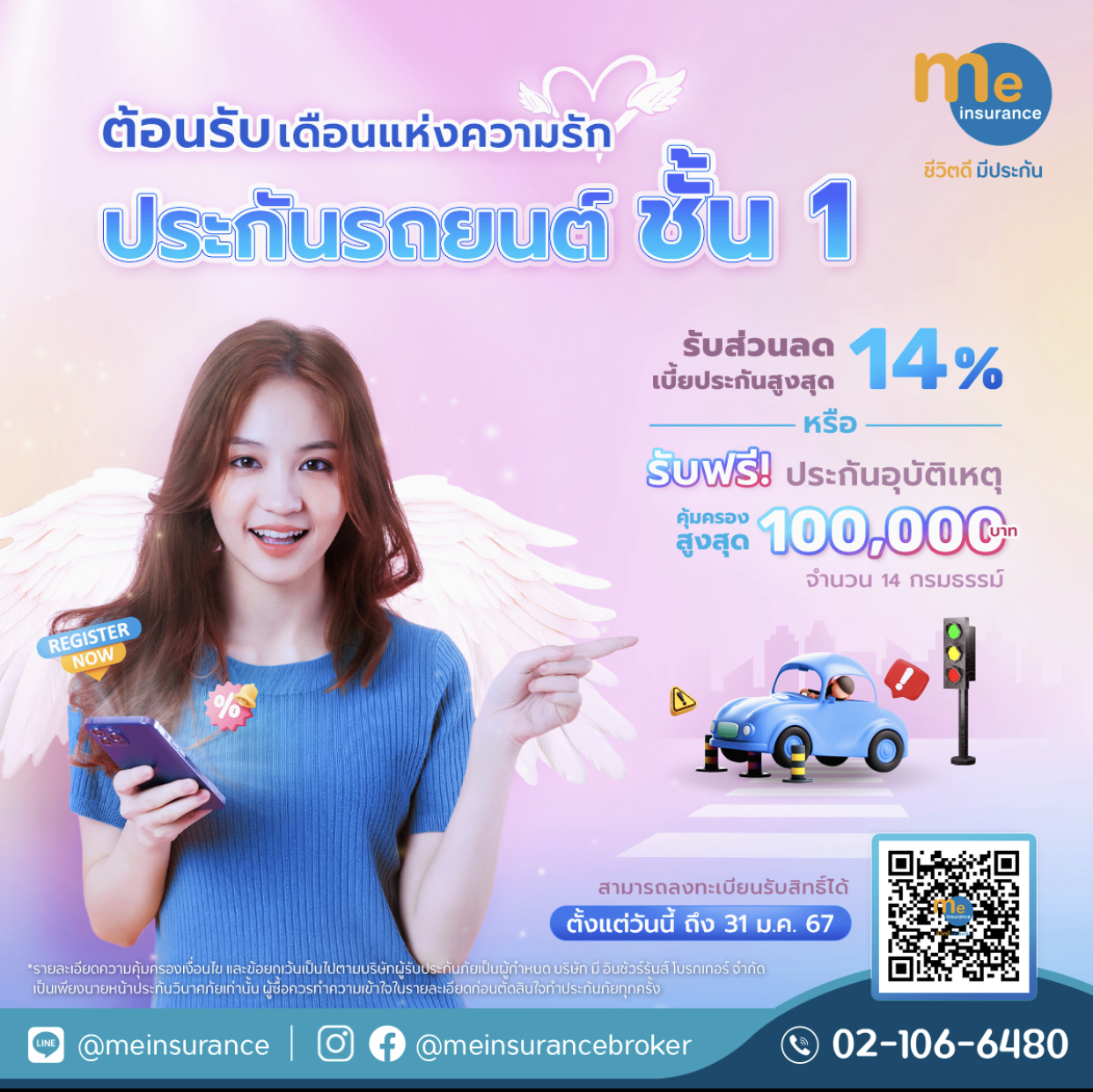 มี อินชัวรันส์ โบรกเกอร์ เพื่อนคู่คิดด้านประกันภัยและสินเชื่อจำนำทะเบียน สนับสนุนลูกค้าเข้าถึงประกันภัยที่มีเบี้ยประกันเริ่มต้นคุ้มค่า และมีความคุ้มครองที่หลากหลาย เปิดตัวแคมเปญพิเศษต้อนรับเดือนแห่งความรัก “ชั้น 1 Lover” สำหรับลูกค้าที่ซื้อประกันภัยรถยนต์ชั้น 1 รับส่วนลดเบี้ยประกันภัยสูงสุด 14% ให้กับรถที่ลูกค้ารัก หรือเลือกรับฟรีประกันภัยอุบัติเหตุ คุ้มครอง 100,000 บาท จำนวน 14 กรมธรรม์ ให้กับลูกค้าและคนที่ลูกค้ารัก ตลอดเดือนกุมภาพันธ์ 2567 โดยลงทะเบียนรับสิทธิพิเศษนี้ได้ตั้งแต่วันนี้เป็นต้นไป (ผู้ซื้อควรทำความเข้าใจในรายละเอียดความคุ้มครองและเงื่อนไขก่อนตัดสินใจทำประกันภัยทุกครั้ง)