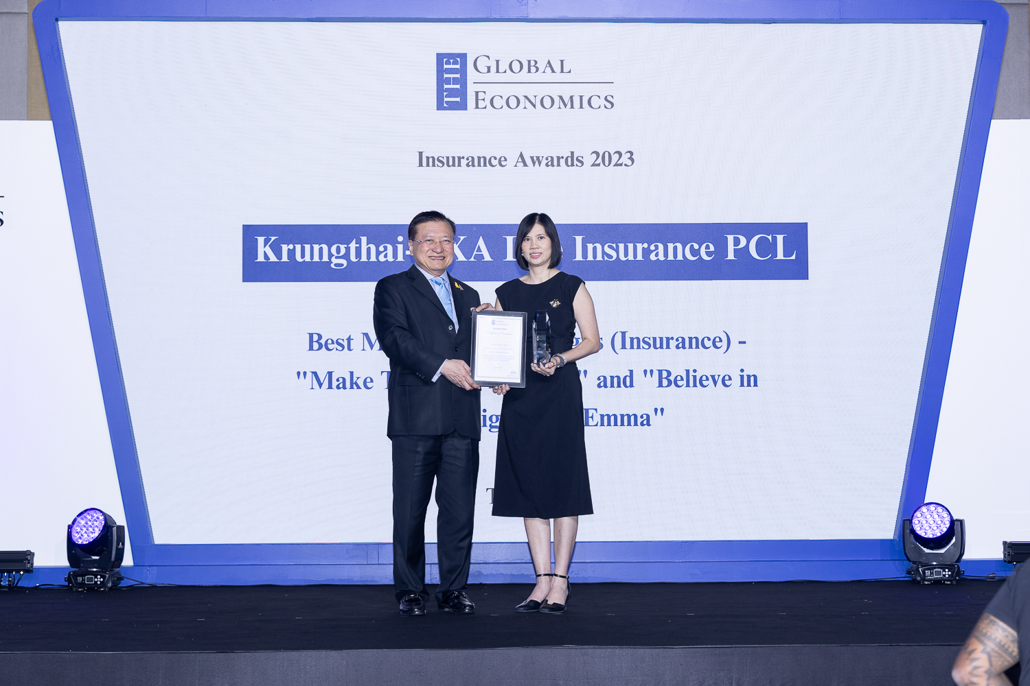 บมจ.กรุงไทย-แอกซ่า ประกันชีวิต คว้า 2 รางวัลใหญ่ระดับนานาชาติ จาก Global Economics Awards 2023 ในสาขา 1. “Best Marketing Campaign in Insurance” และ 2. “Best Distribution Channel in Insurance” โดยมีคุณมนต์นิดา มุสิกบุตร ประธานเจ้าหน้าที่บริหารช่องทางคู่ค้า (คนขวา) และคุณกาญจนา อนันตสมบูรณ์ รองประธาน สื่อสารองค์กรและกิจกรรมเพื่อสังคม (คนซ้าย) เป็นตัวแทนเข้ารับมอบรางวัล ซึ่งรางวัลนี้เป็นอีกหนึ่งความภาคภูมิใจของบริษัทฯ ที่ประสบความสำเร็จในการมุ่งมั่นพัฒนาศักยภาพของฝ่ายขายมืออาชีพที่มีความเชี่ยวชาญในทุกๆ ด้าน พร้อมทั้งยังสนับสนุนด้านการฝึกอบรม และการพัฒนาเทคโนโลยีสำหรับฝ่ายขาย เพื่อสนองตอบความต้องการของลูกค้า และส่งมอบประสบการณ์ที่ดีให้แก่ลูกค้าคนสำคัญของเรา รวมถึงการเป็นผู้นำในด้านแบรนด์ของธุรกิจประกันชีวิต ที่มีความโดดเด่น และเป็นแบรนด์ที่อยู่ในใจของทุกคน สอดคล้องกับนโยบายหลักของบริษัทฯ ที่พร้อมอยู่เคียงข้างทุกความเชื่อมั่น ดูแลกันตลอดไป