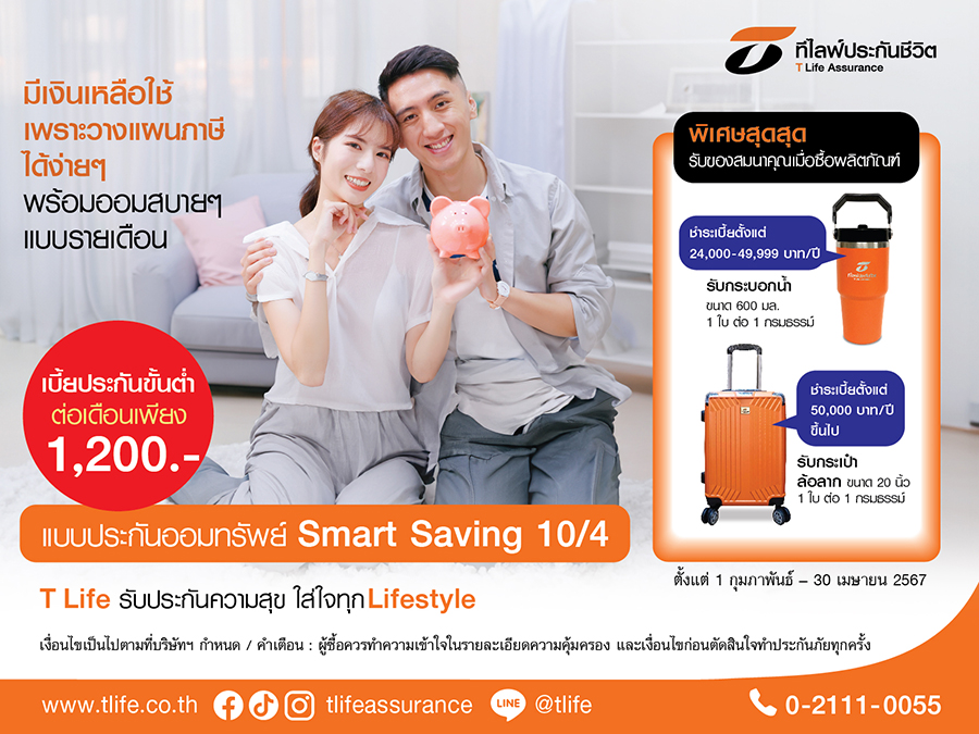โดย “ประกันออมทรัพย์ Smart Saving 10/4” มีจุดเด่น คือ สามารถนำเบี้ยประกันภัยไปลดหย่อนภาษีเงินได้บุคคลธรรมดาตามเงื่อนไขที่กรมสรรพากรกำหนด ชำระเบี้ยประกันสั้นเพียง 4 ปี คุ้มครองนานถึง 10 ปี การันตีรับเงินคืนทุกปีสูงสุด 6% ของจำนวนเงินเอาประกันภัย รับเงินคืนครบกำหนดสัญญา 410% ของจำนวนเงินเอาประกันภัย ณ สิ้นปีกรมธรรม์ที่ 10 รวมผลประโยชน์เงินคืนตลอดสัญญา 460% และคุ้มครองชีวิตสูงสุด 440% ของจำนวนเงินเอาประกันภัย สมัครง่ายไม่ต้องตรวจสุขภาพและไม่ต้องตอบคำถามสุขภาพ(เงื่อนไขตามที่บริษัทฯ กำหนด) สามารถชำระค่าเบี้ยประกันด้วยบัตรเครดิต Visa และ Master ได้ทุกปีกรมธรรม์ อีกทั้งยังแบ่งชำระรายเดือนขั้นต่ำเดือนละ 1,200 บาท ได้โดยไม่ต้องเสียดอกเบี้ย จำนวนเงินเอาประกันภัยเริ่มต้น 14,400 บาท และอายุรับประกันตั้งแต่ 1 เดือน 1 วัน – 65 ปี พร้อมรับของสมนาคุณ ฟรี! “กระเป๋าล้อลาก” ขนาด 20 นิ้ว เมื่อชำระเบี้ยประกันรายปี ตั้งแต่ 50,000 บาท ขึ้นไป หรือ รับ“กระบอกน้ำ T Life” เมื่อชำระเบี้ยประกันรายปี ตั้งแต่ 24,000 – 49,999 บาท ตั้งแต่วันนี้ – 30 เมษายน 2567